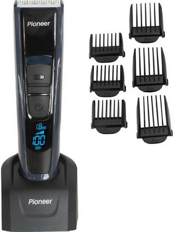 Машинка для стрижки волос Pioneer со стальным и керамическим движущимся лезвиями, 2 скорости, 7 насадок, работа от аккумулятора