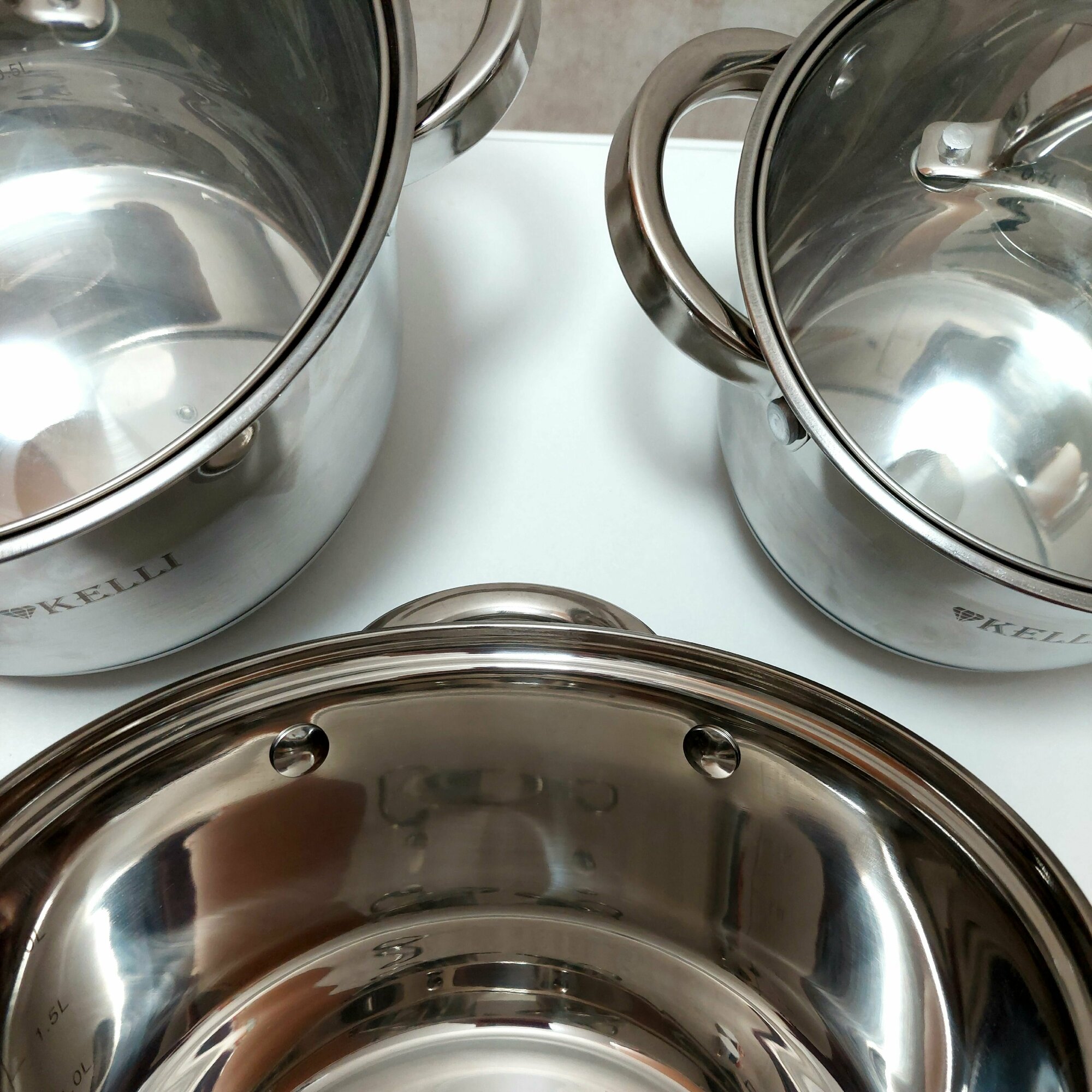 | Дополнительная информация | стеклянные крышки, стальные ручки, семислойное дно, мерная шкала, диаметр кастрюль: 16см, 18см, 20см, клепаные ненагревающиеся ручки |