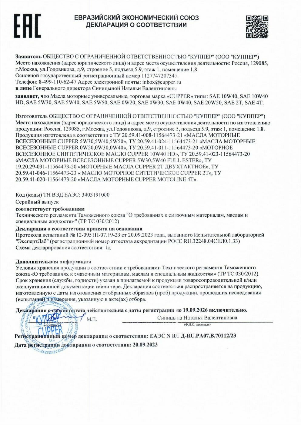 Синтетическое моторное масло CUPPER NS Line 5W-30, 4 л, 4 кг