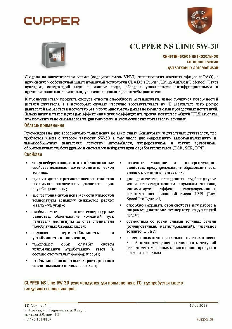 СохранитьCupper CUPPERМасло моторное NS Line 5W30 (10 л ) NS5W30-10 . интересное: