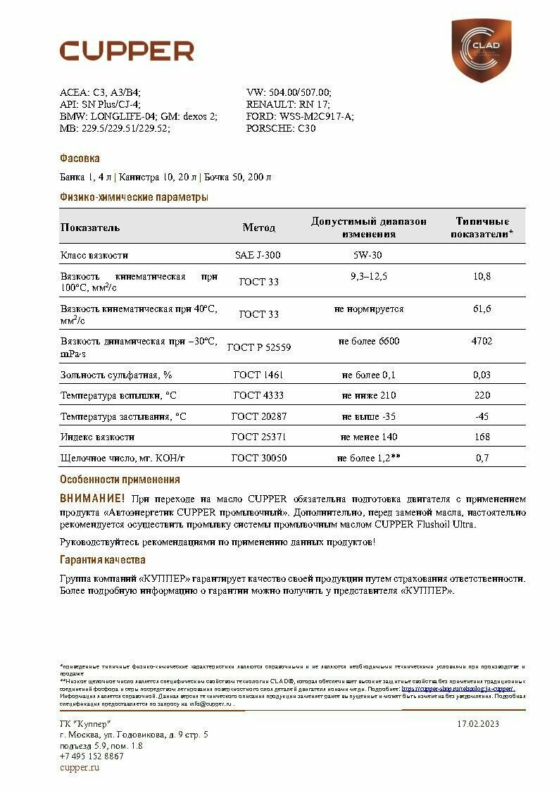 | Допуски OEM | BMW Longlife-04 / Renault RN 0720 / Renault RN 0710 / Ford WSS-M2C 934-B / PORSCHE C30 / Ford WSS-M2C 913-C |