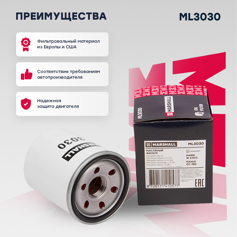 ML3030 MARSHALL Фильтр масляный Mitsubishi ASX 10- / Lancer III-VIII 89- / Outlander II, III 06- / Pajero I-III 88-