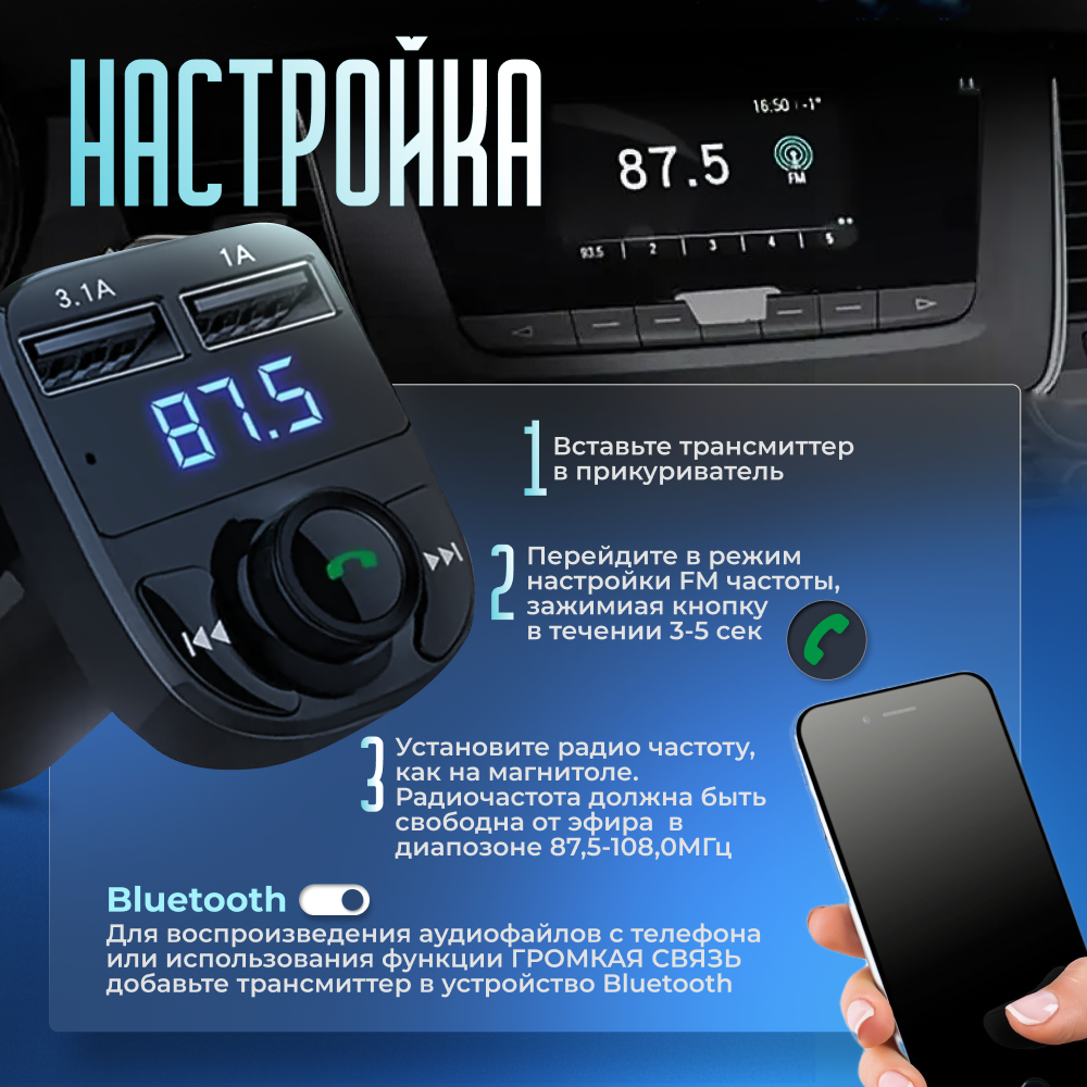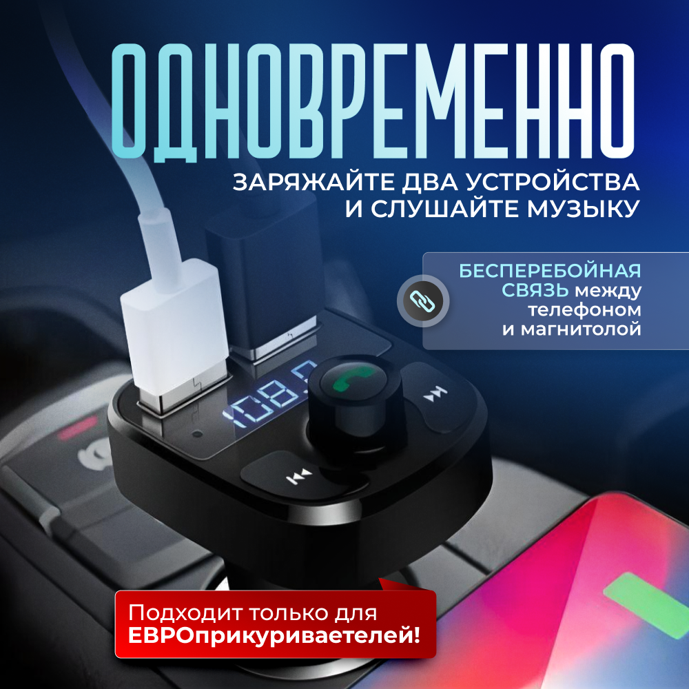 FM трансмиттер Bluetooth модулятор автомобильный, адаптер быстрой зарядки для телефона в прикуриватель машины с 2 USB, цвет черный интересное: