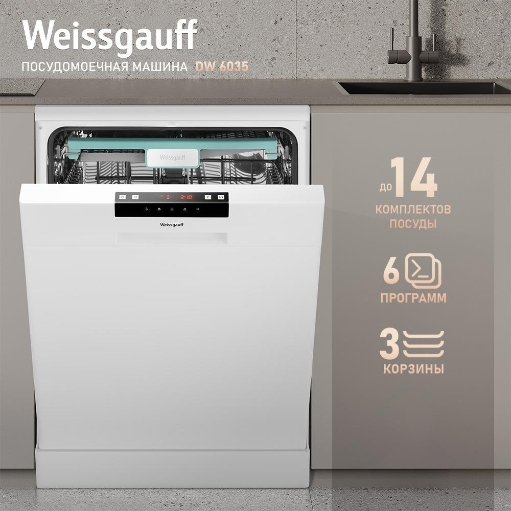 Купить Посудомоечная машина Weissgauff DW 6035 (модификация 2024 года),3 года гарантии, 3 корзины, 14 комплектов, 6 программ, половинная загрузка, Полная защита от протечек, Таймер до 24 часов, Возможность дозагрузки посуды