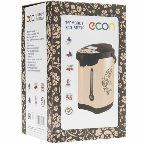 Термопот econ ECO-502TP электрический, Мощность 750Вт, Объем 5 литров, Способ подачи воды - механический, электрический, касанием чашкой, Защита от перегрева, Защита от перепада напряжения, Функция повторного кипячения.