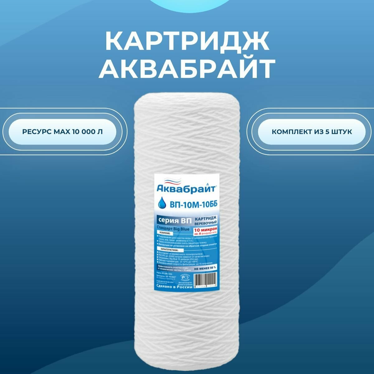 Картридж из верёвочного полипропилена аквабрайт ВП-10М-10ББ Комплект из 5шт