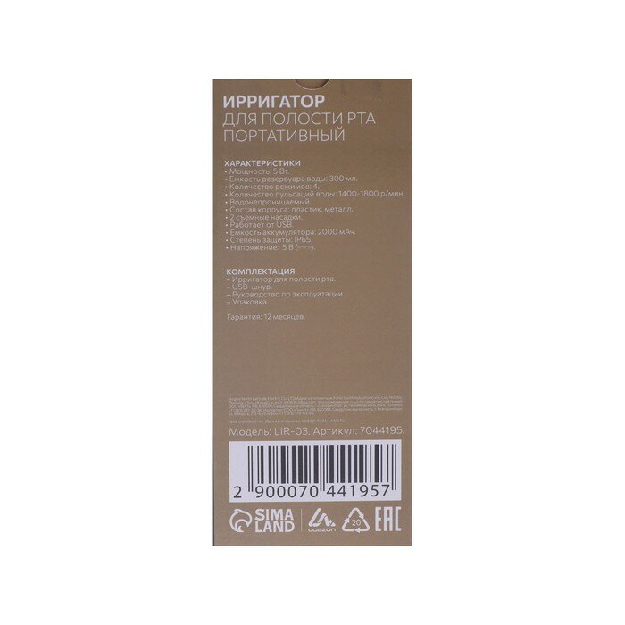 Ирригатор для полости рта Luazon LIR-02, портативный, 200 мл, 3 режима, 1 насадка, от USB Luazon Hom .