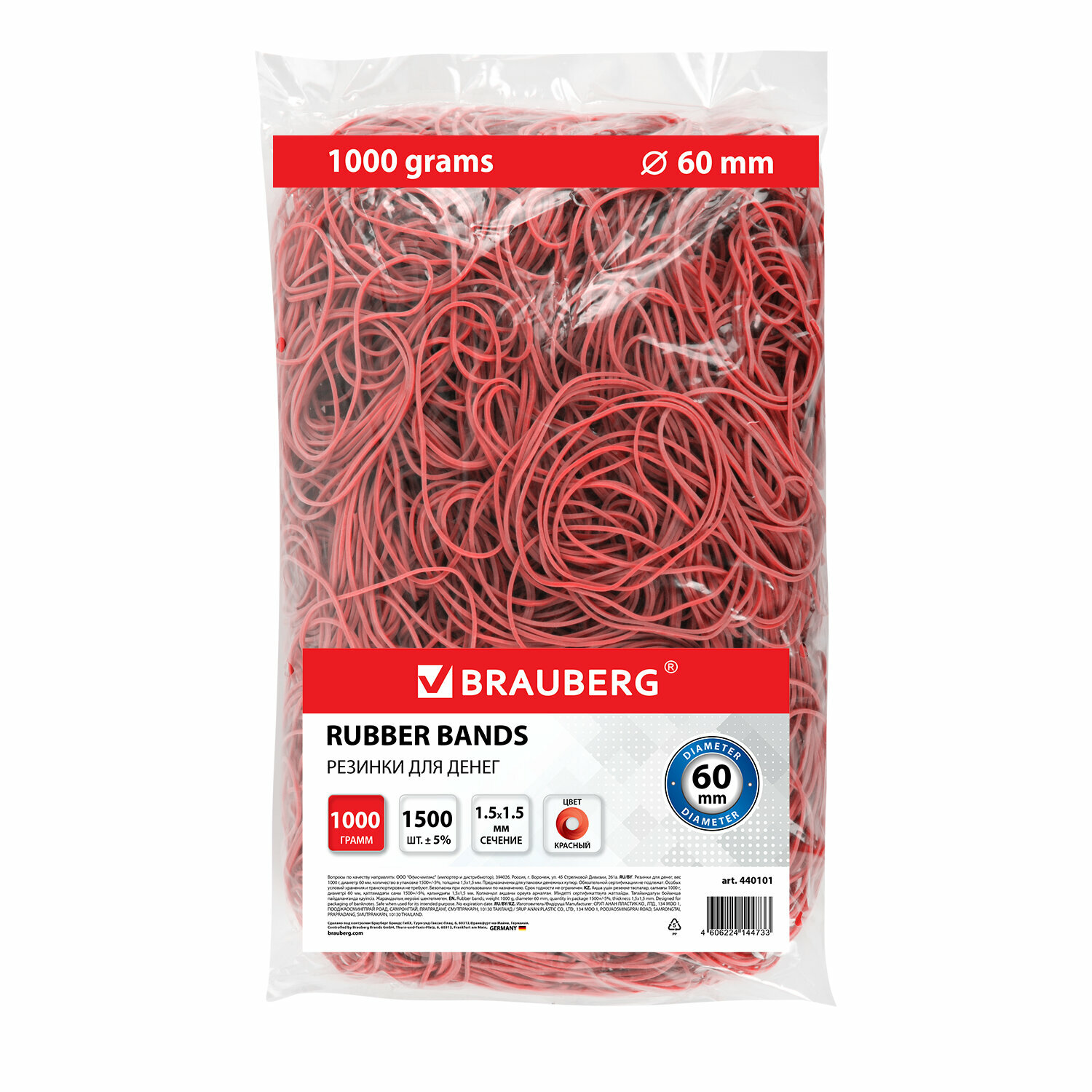 Резинки канцелярские для денег BRAUBERG d 60 мм, BRAUBERG 1000 г, цветные, натуральный каучук
