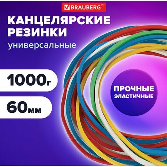 Резинки канцелярские для денег BRAUBERG d 60 мм, BRAUBERG 1000 г, цветные, натуральный каучук