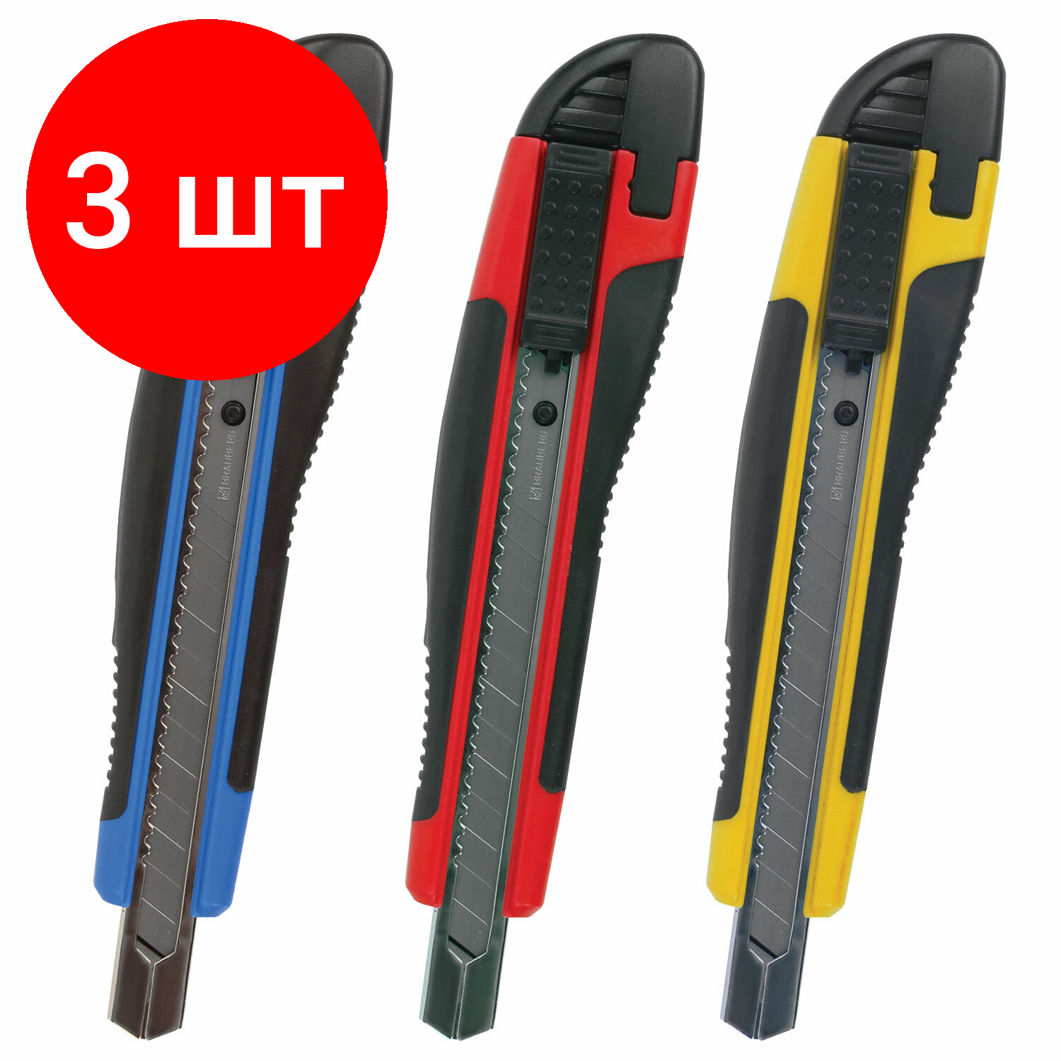 Комплект 3 шт, Нож канцелярский 9 мм BRAUBERG "Universal", автофиксатор, цвет ассорти, резиновые вставки, блистер, 236970