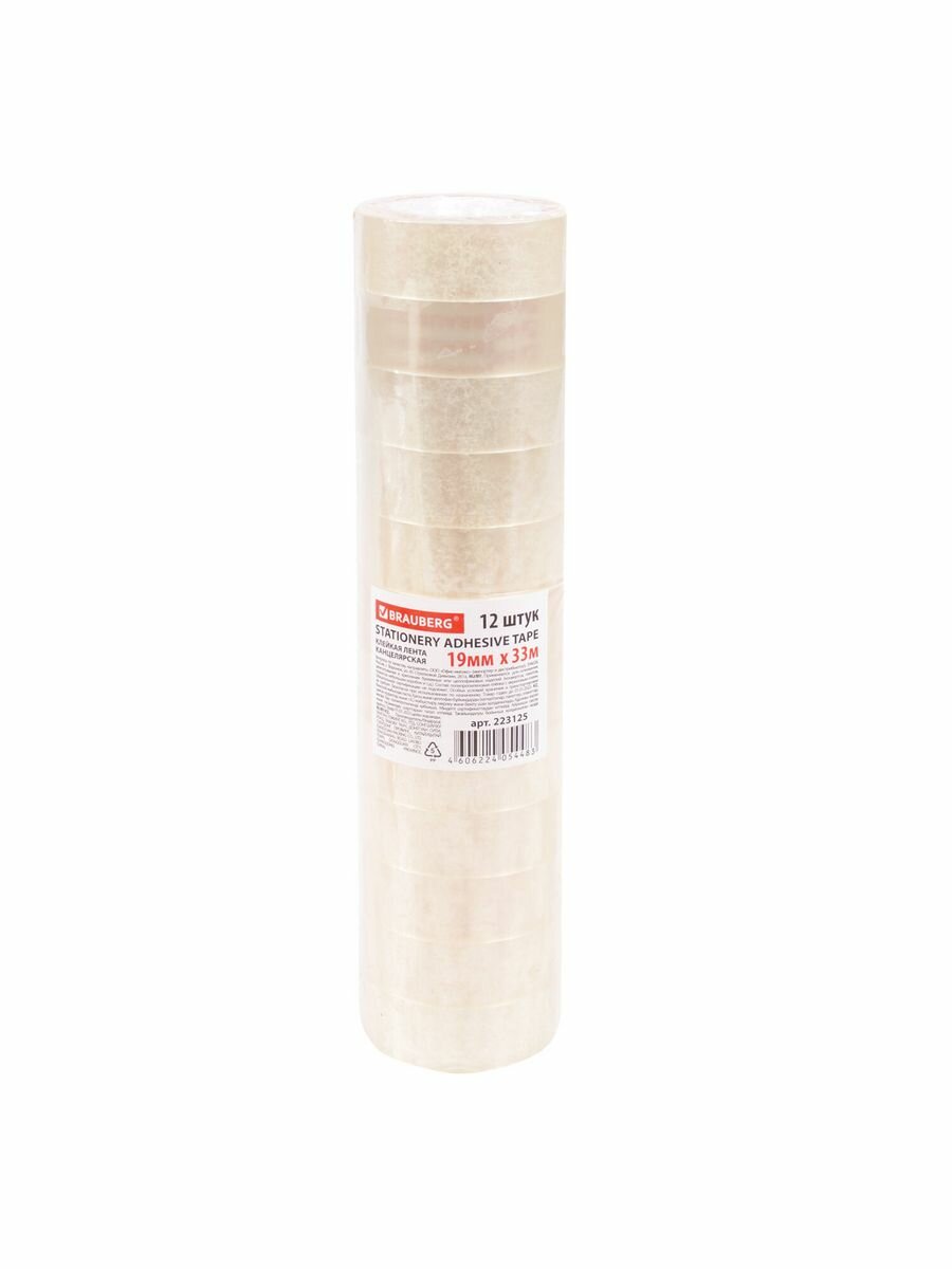 Скотч Brauberg, прозрачный, матовый, офисный, длина 33 м, ширина 12 мм, 12 штук