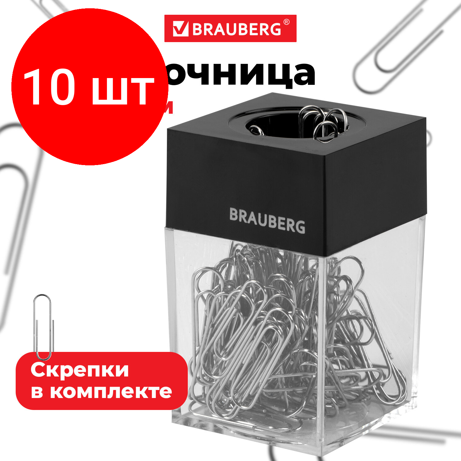 Купить Комплект 10 шт, Скрепочница магнитная BRAUBERG со 100 никелированными скрепками 28 мм, прозрачный корпус, 228400