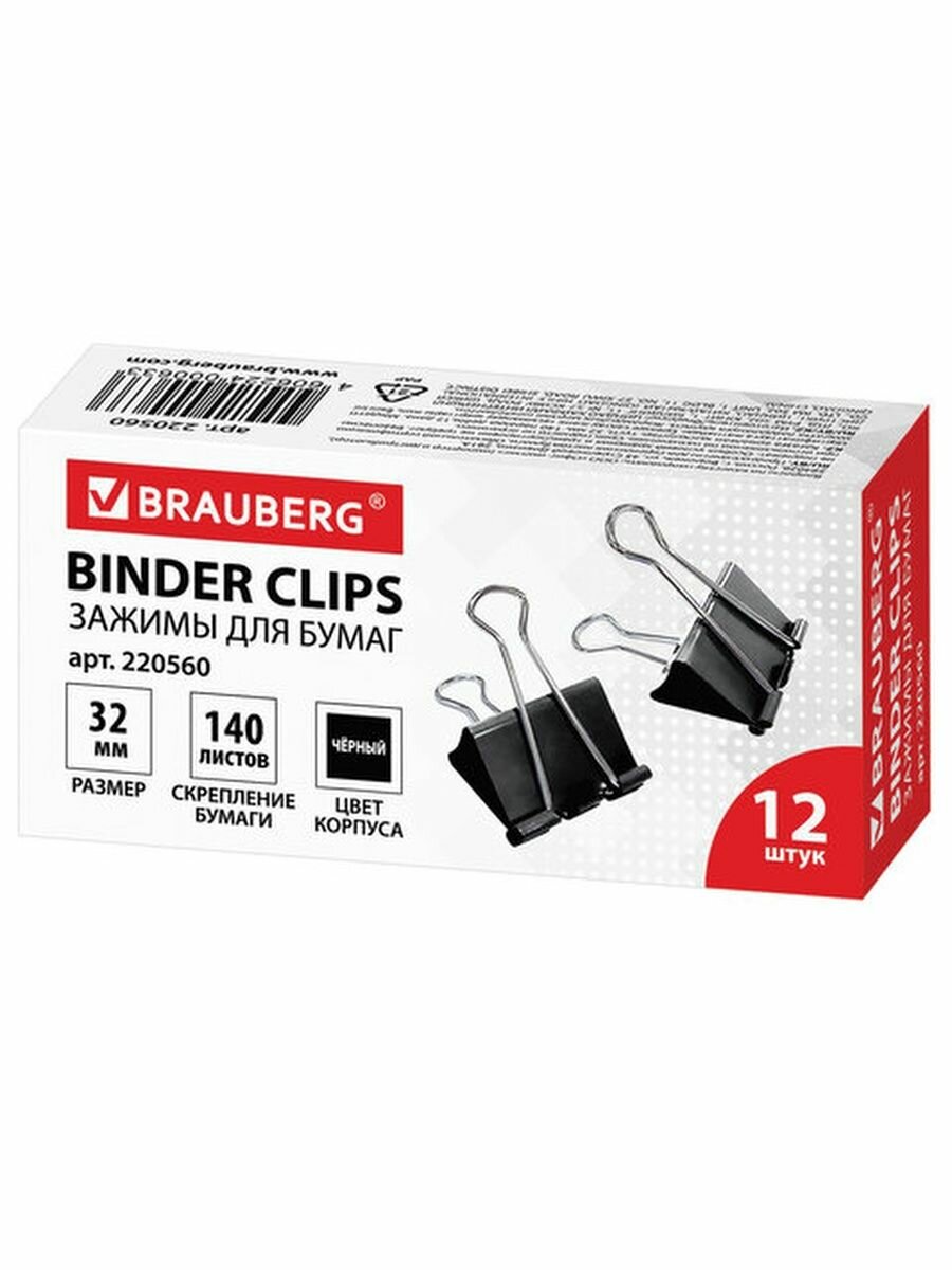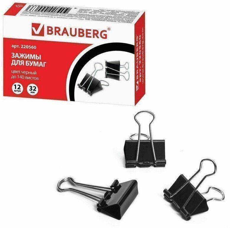 Зажимы для бумаг BRAUBERG, комплект 12 шт., 32 мм, на 140 листов, черные, картонная коробка, 220560 (цена за 1 ед.товара)