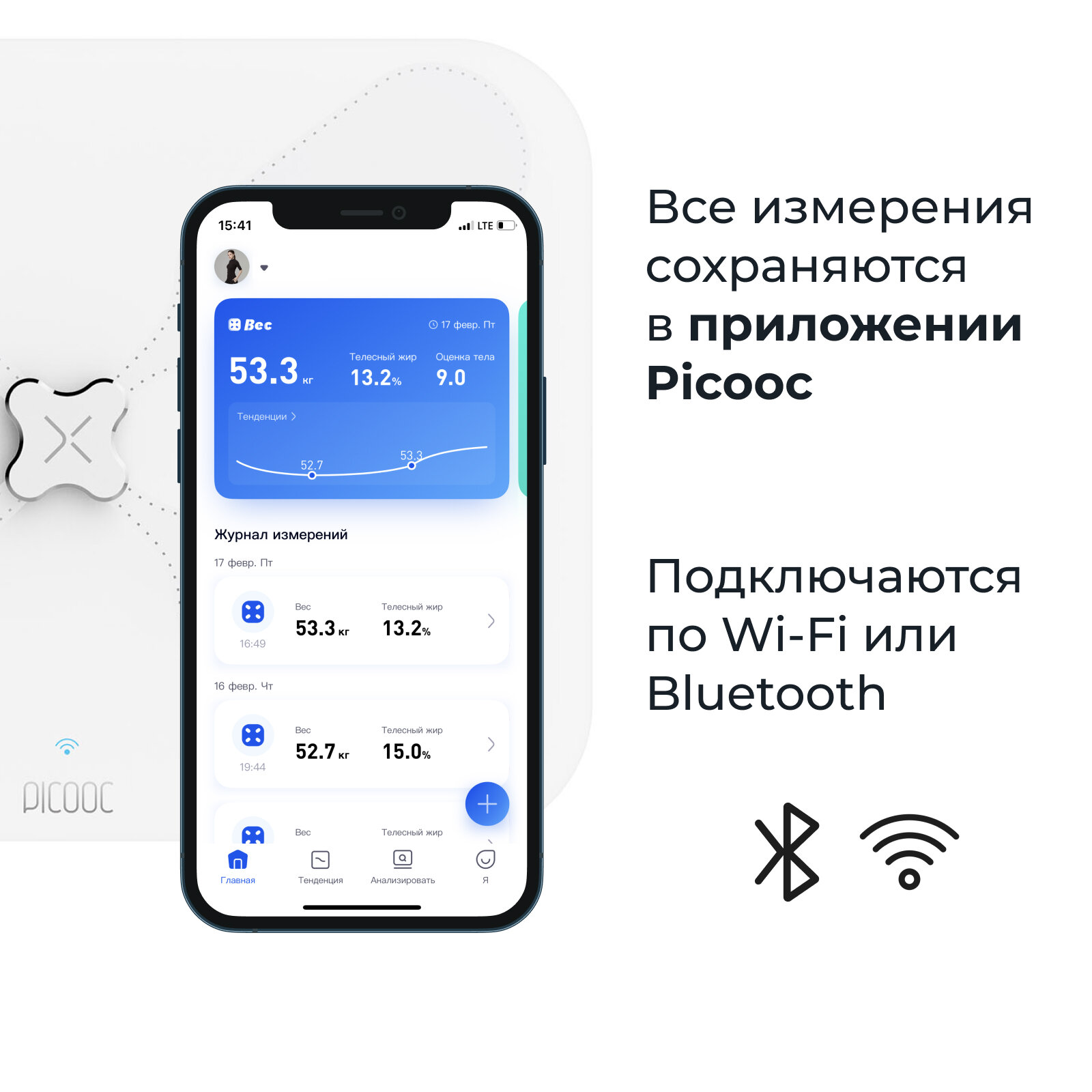 | Плюсы: | Удобная интеграция, использую связку PICOOC - Google Fit - Health Sync - Samsung Health, работает без нареканий |