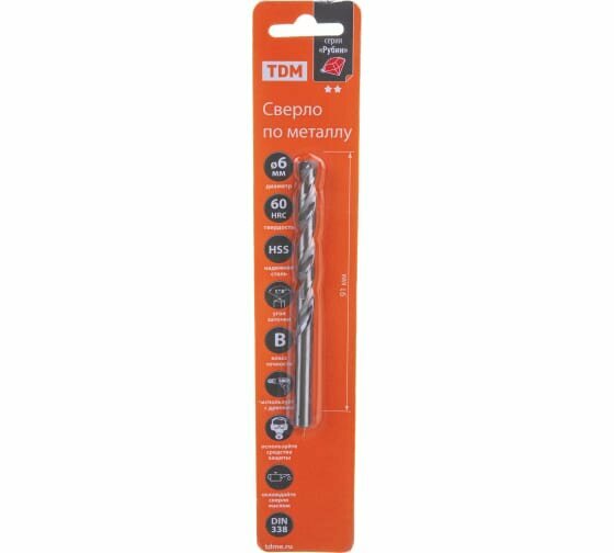 TDM Сверло по металлу, 6 мм, полир., HSS, класс точн. В, 118град., цилиндр. хв., блистер 1 шт, Рубин