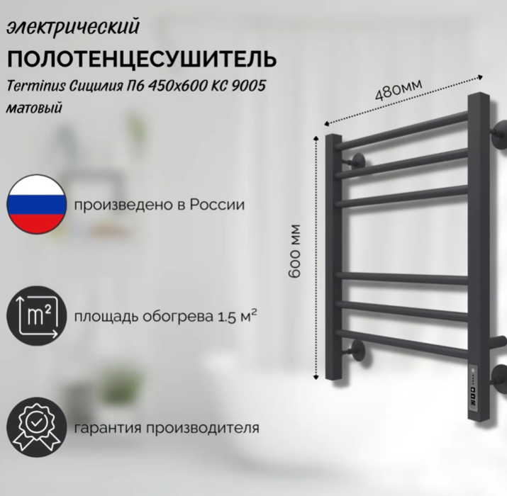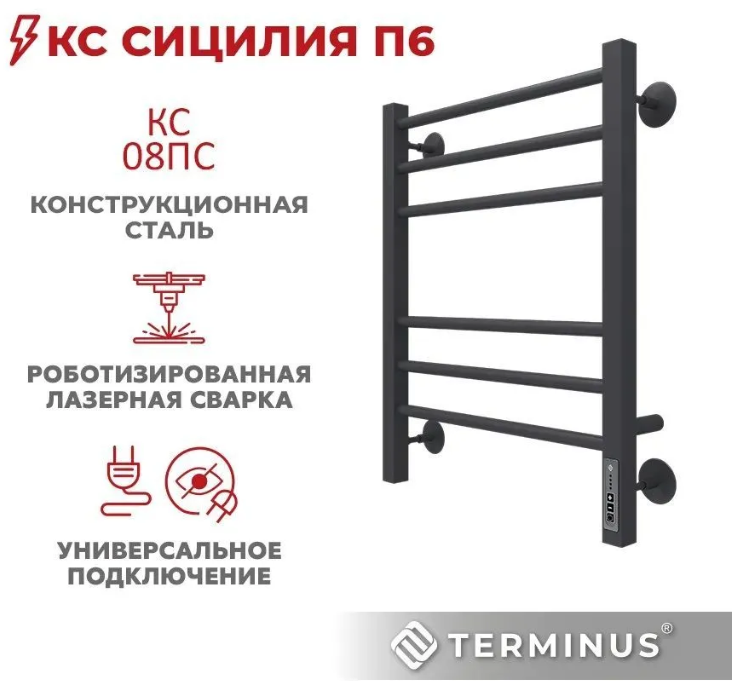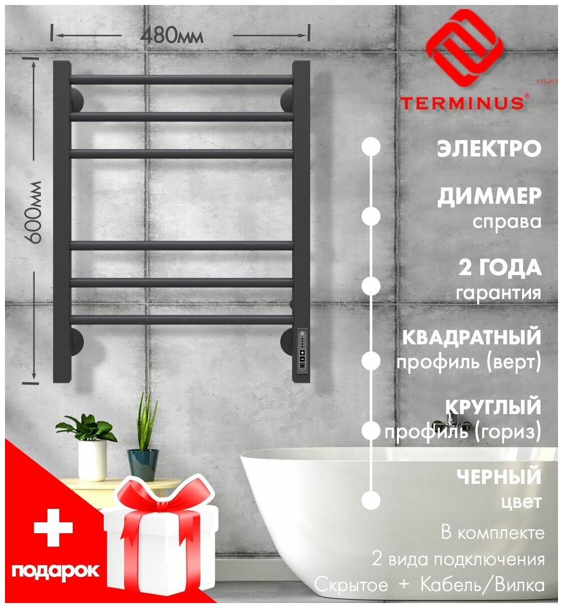 Полотенцесушитель электрический черный TERMINUS Сицилия П6 450х600 КС 9005 матовый ( new встроен диммер) КС 9005 матовый ( new встроен диммер) Полотенцесушитель TERMINUS