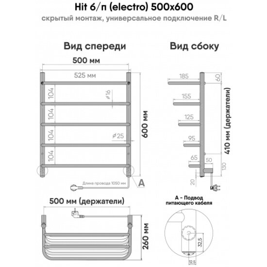 Полотенцесушитель электрический Hit INDIGO 60/50 скрытый монтаж, универсальное подключение