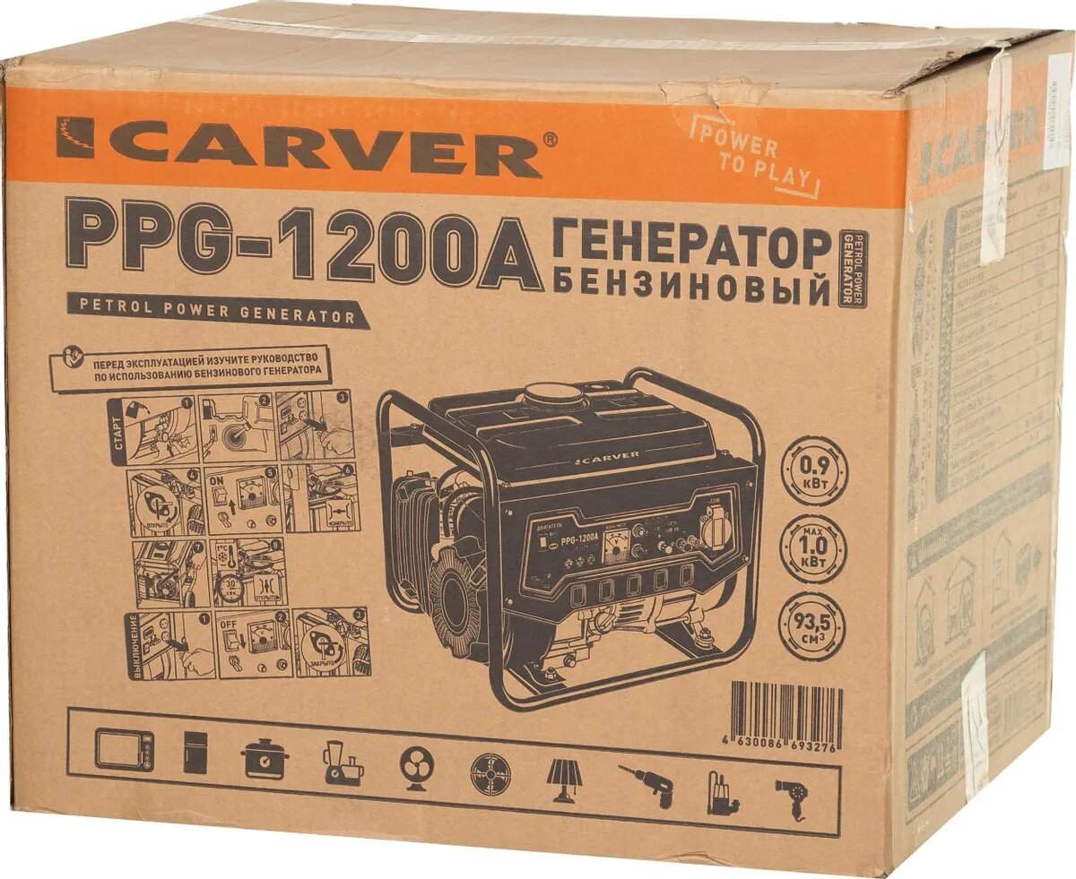 Генератор Carver Ppg- 1200А, бенз., 0.9/1.05кВт, 220В, бак 6 л Carver 2328941
