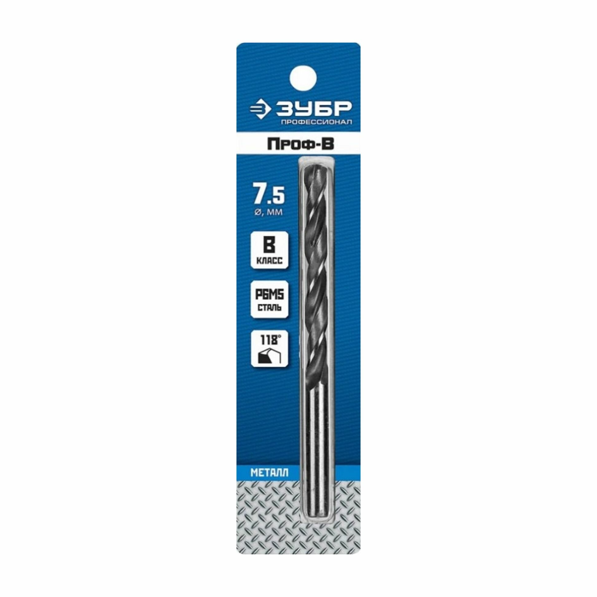 ЗУБР ПРОФ-в 7.5х109мм, Сверло по металлу, сталь Р6М5, класс В, 29621-7.5, Серия Профессионал