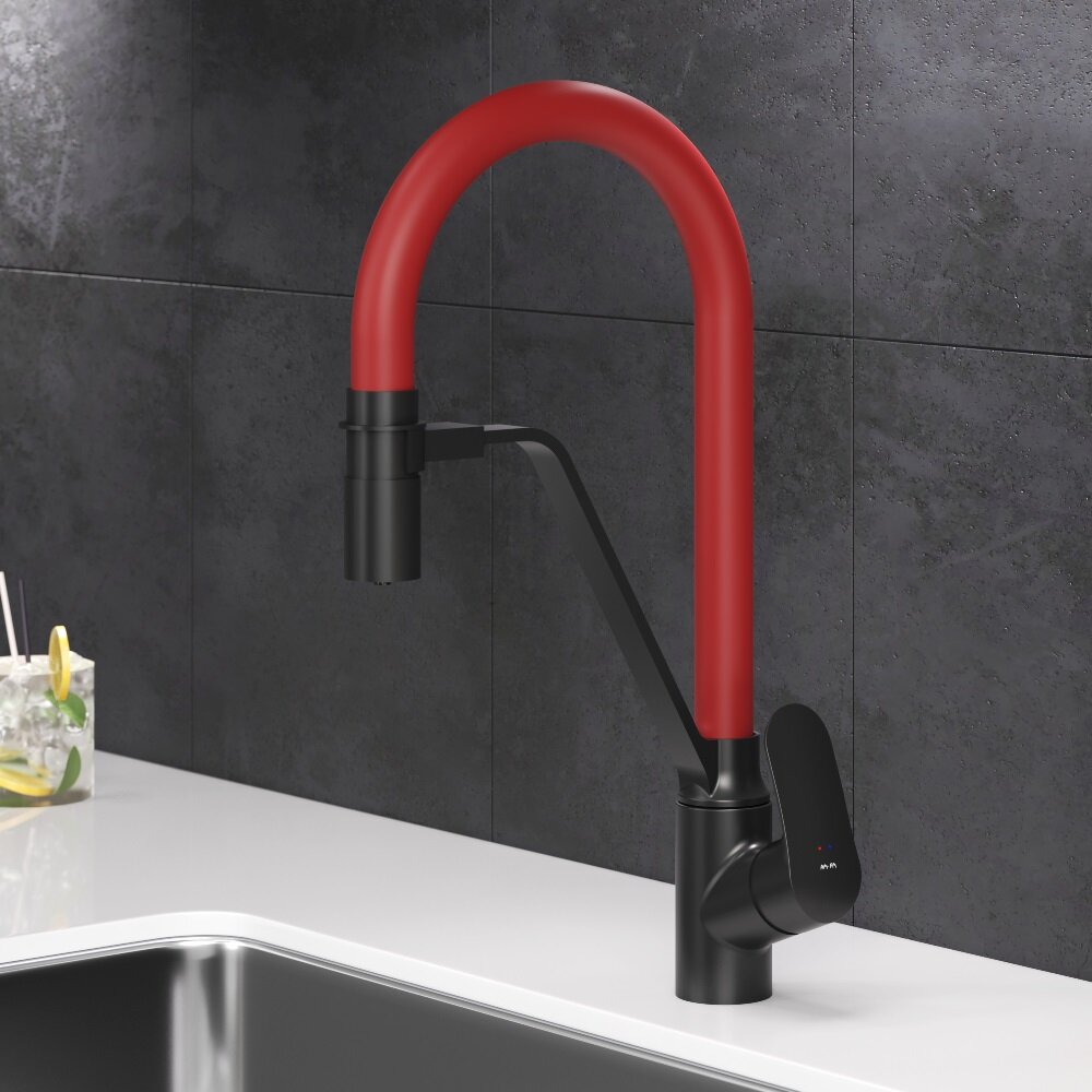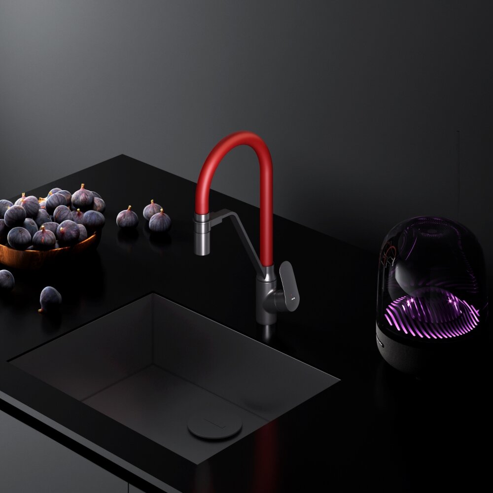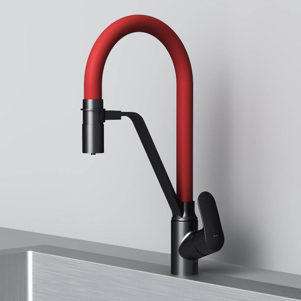 Смеситель для кухни AM.PM Like F8007828 высокий, черный, с красным гибким изливом и каналом питьевой воды