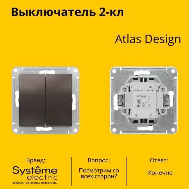СохранитьВыключатель электрический Schneider Electric (Systeme Electric) Atlas Design 2-клавишный, 10А, 10 AX, Мокко ATN000651 - 10 шт. интересное: