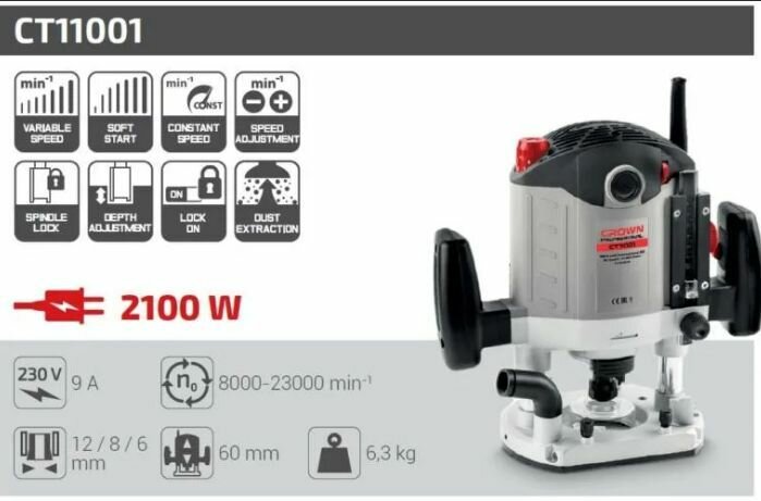 Фрезер универсальный CROWN CT11001 (2100Вт, цанги 12/8/6 мм, 60мм, 6,3кг)