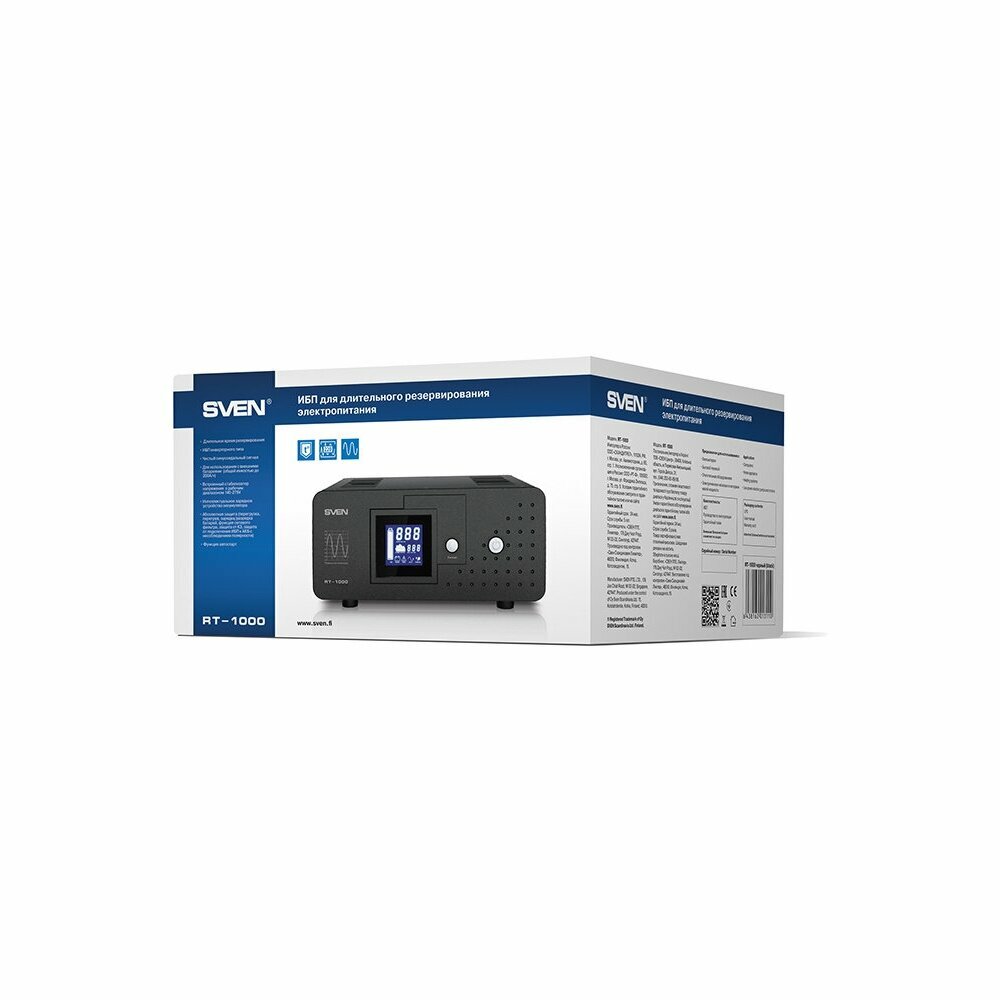 Sven ИБП SVEN RT-1000, линейно-интерактивный непрерывного действия с длительным временем резервирования, автоматический стабилизатор напряжения, 600Вт, 1000Ва, 2 евророзетки, аккумуляторные батареи в комплект не входят, 300мм x 270мм x 140мм, 9.9 кг/ UPS