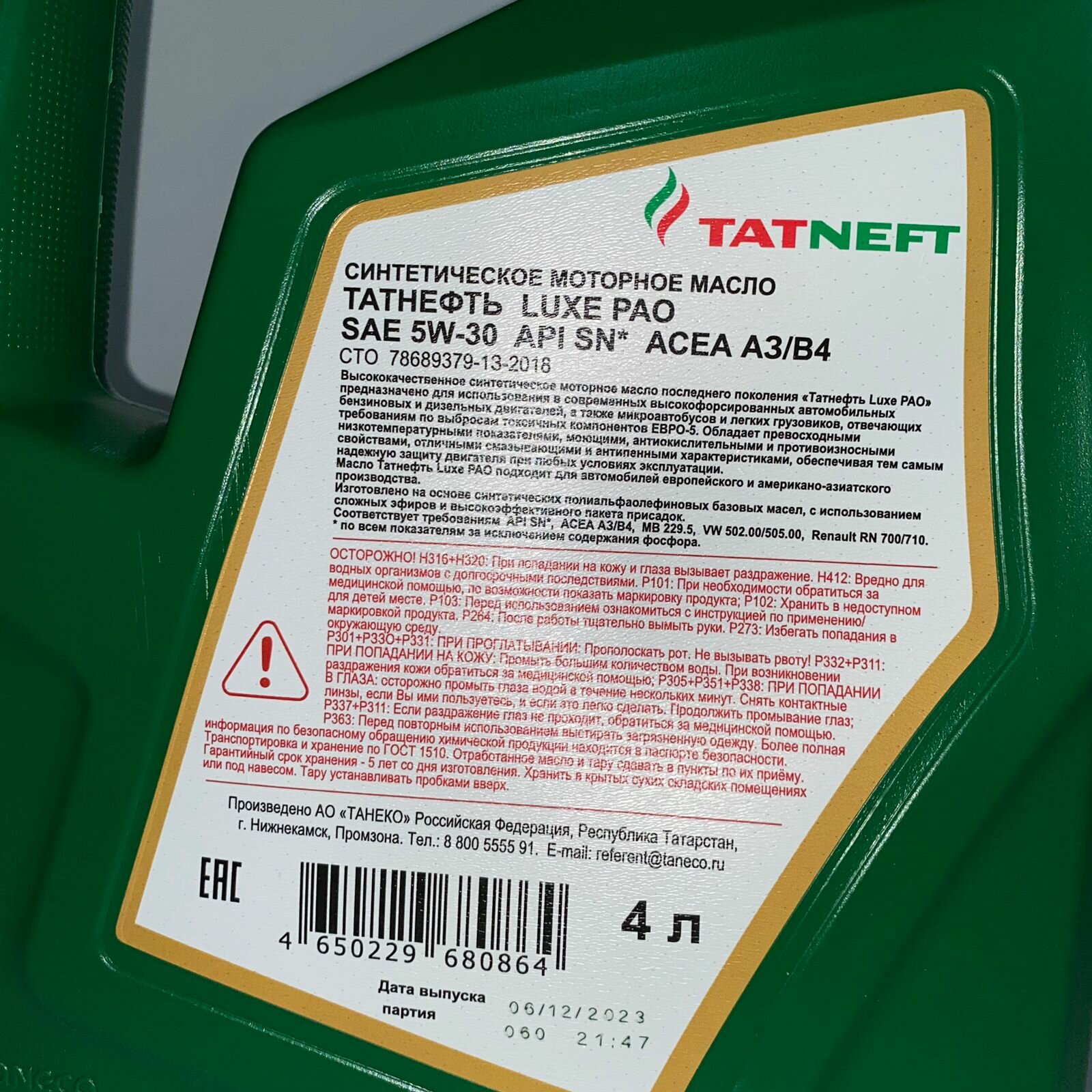 TATNEFT 4650229680864 Масо моторные синтетические татнефть LUXE PAO SAE 5W-30 канистра 4 (второй номер 12116)