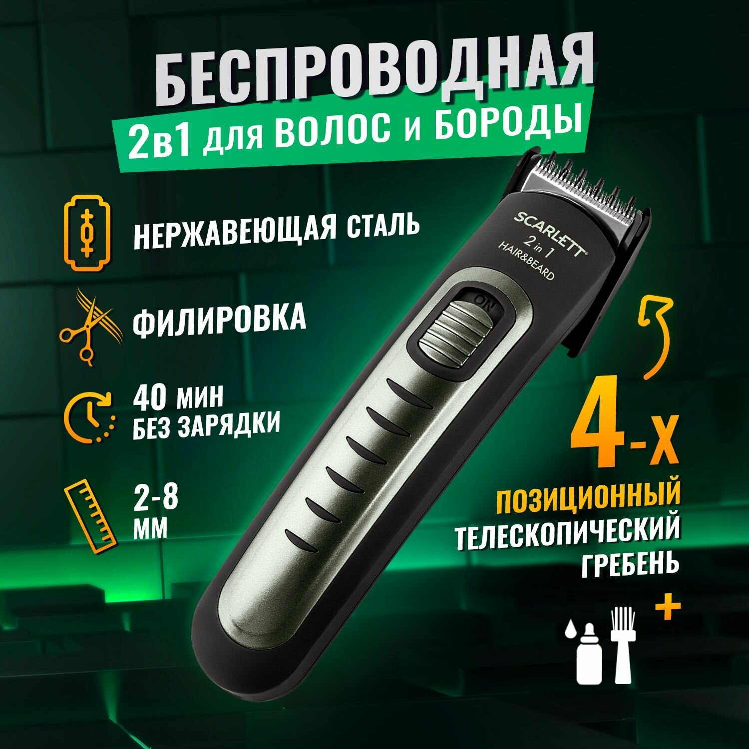 Машинка для стрижки Scarlett SC-HC63055 черный/серебристый [длина 2-8 мм, с помощью регулятора, насадок-1, автономное, нерж.сталь]