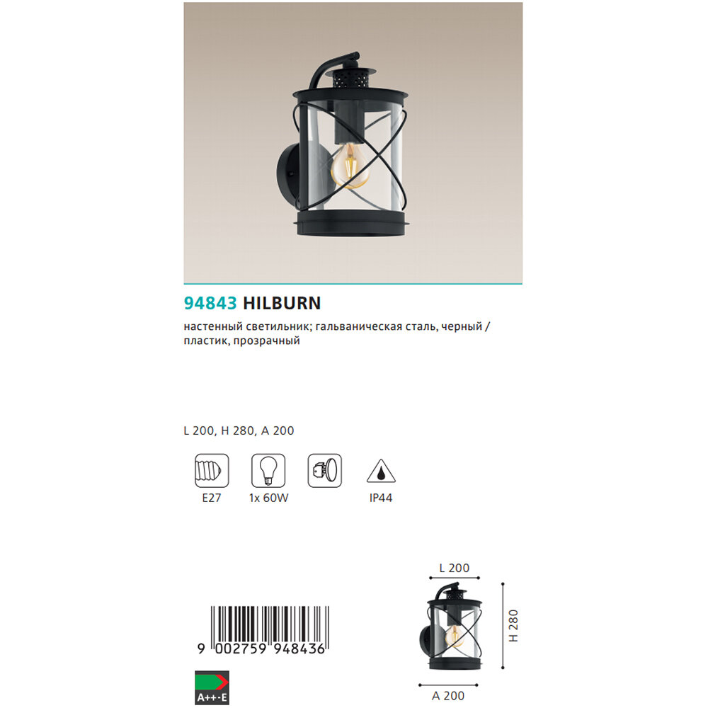 Уличный настенный светильник Eglo Hilburn 94843, Черный, E27 60