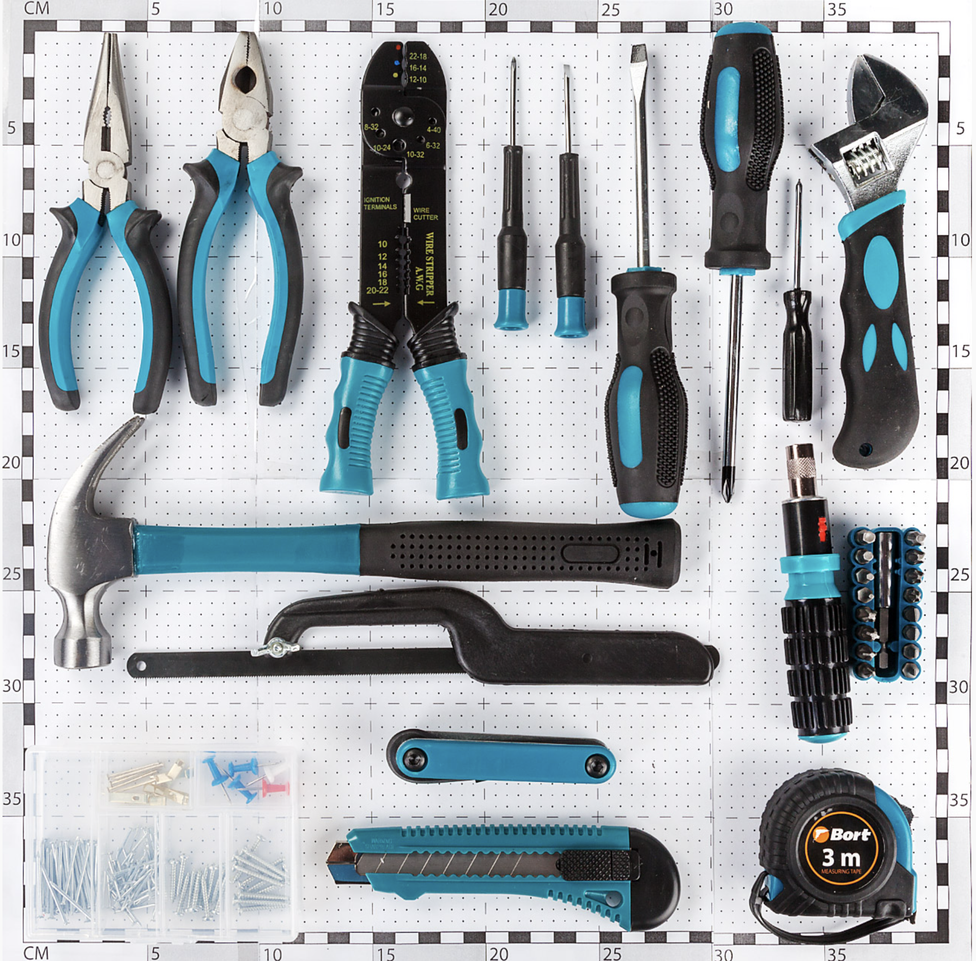 | Ручной инструмент подробно | молоток - 1 шт.; нож - 1 шт.; ножовка - 1 шт.; органайзер с крепежом - 1 шт.; рулетка 3 м - 1 шт.; магнитный держатель - 1 шт. |