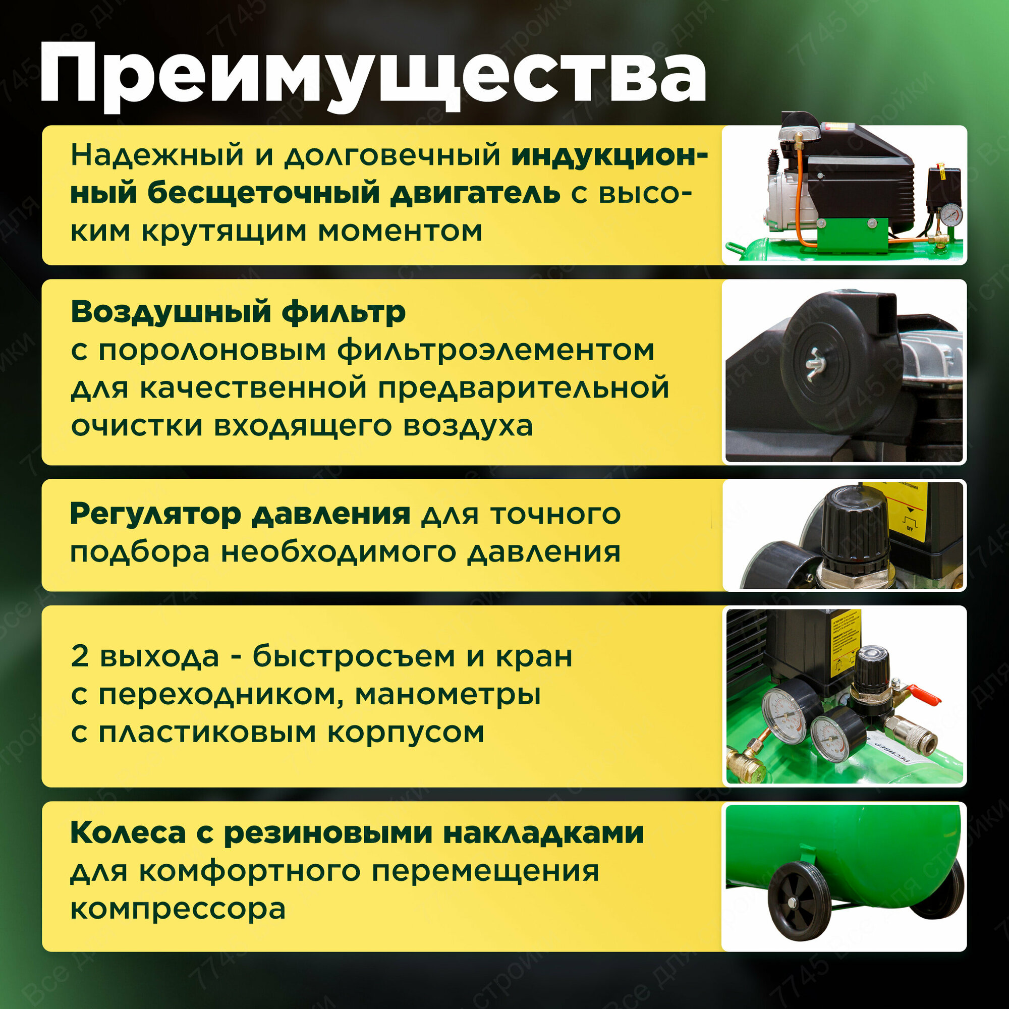 на корпусе компрессора имеется удобная ручка. Объём ресивера 50 бар. Имеется функция регулировки давления. Также компрессор оборудован защитой от перегрева. Пропускная способность составляет 260 л/мин.
