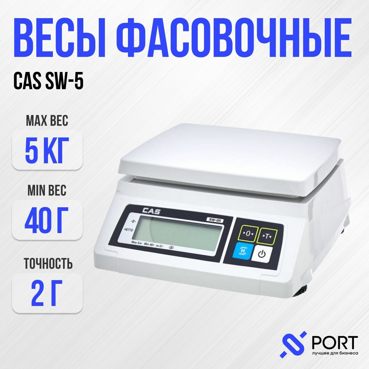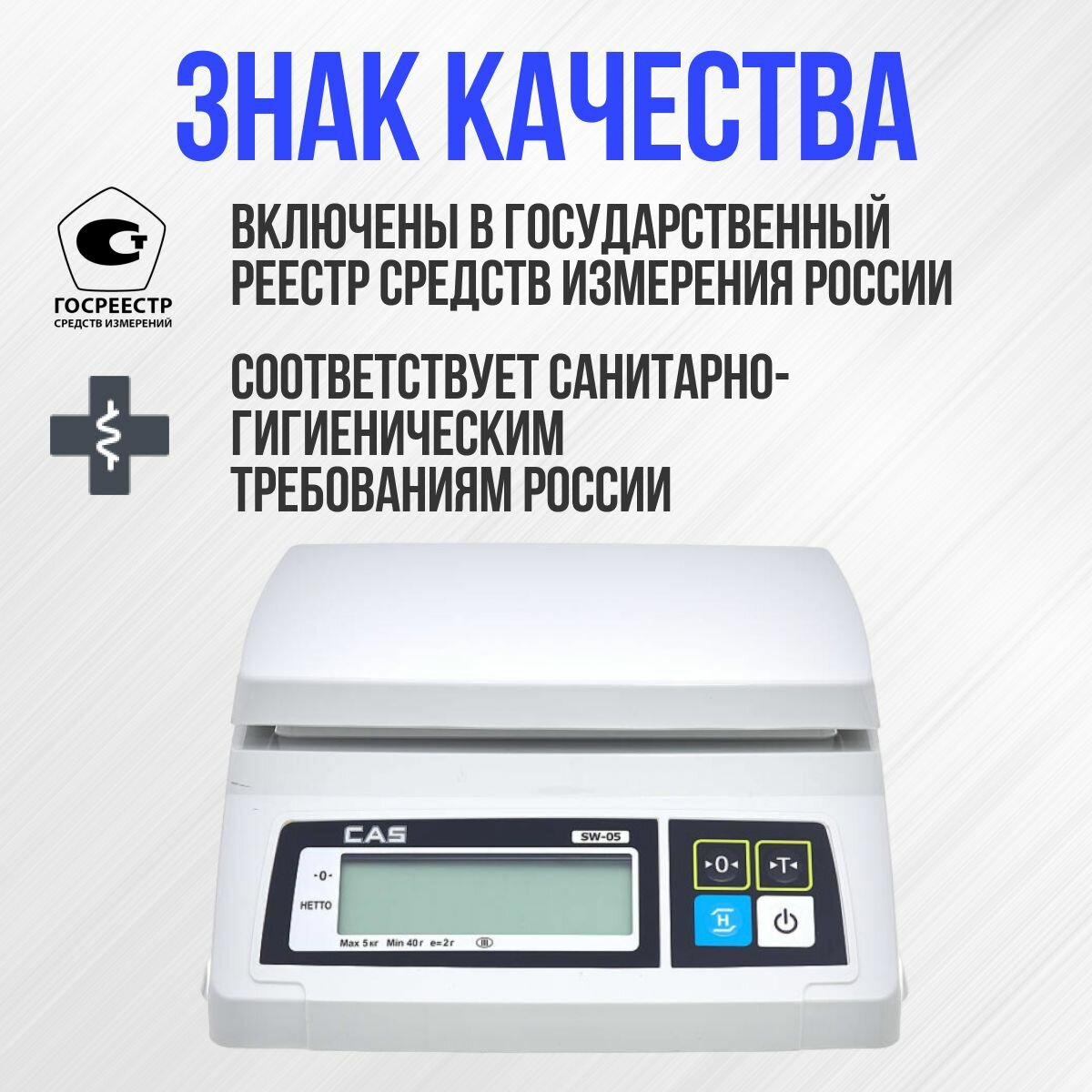 Весы электронные порционные CAS SW-05, весы кухонные настольные с адаптером, до 5 кг
