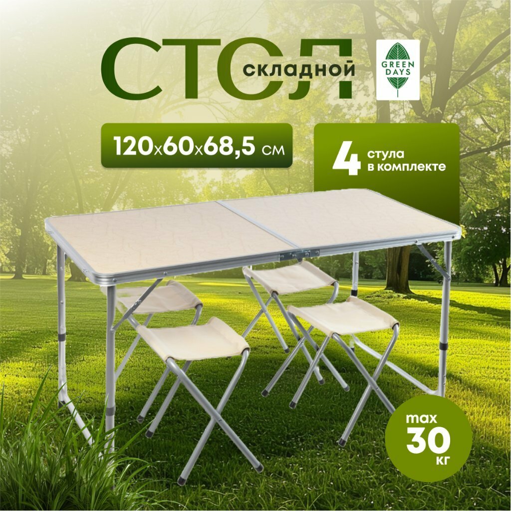 СохранитьСтол складной металл, прямоугольный, 120х60х68.5 см, столешница МДФ, бежевый, Green Days, 4 стула интересное: