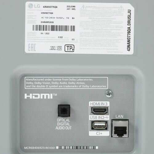 | Разъемы и интерфейсы | Ethernet - RJ-45 / вход HDMI x 3 / USB Type-A x 2 / слот CI/CI+ / выход аудио цифровой оптический |