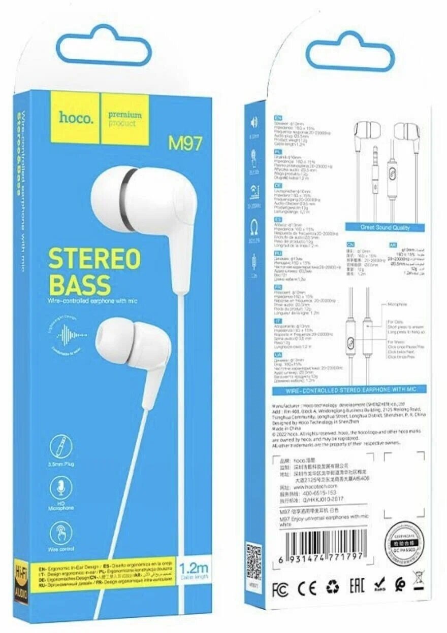 Наушники внутриканальные HOCO M97, кабель Jack 3.5mm, 1.2м, цвет: чёрный