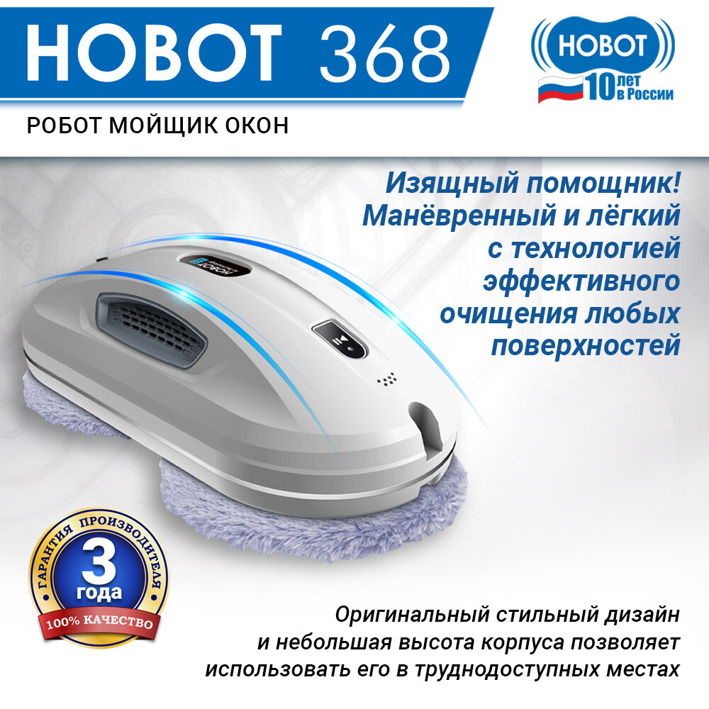 В итоге остановила свой выбор на Hobot 368. Работает быстро, в комплекте 6 пар чистящих салфеток-насадок. Но я докупила ещё 1 комплект из 6 пар салфеток, так как менять их надо сразу, как только робот 1 раз помыл 1 окно, иначе пойдут разводы от грязной салфетки. Мощный, гарантия 3 года |