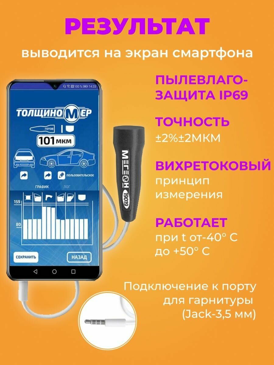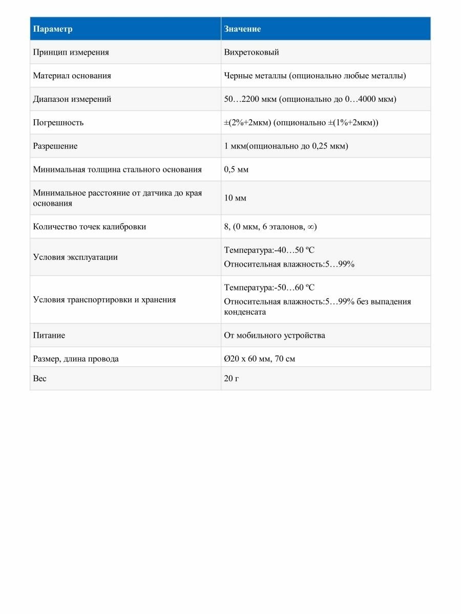 | Дополнительная информация | для мобильных устройств под управлением ОС Android версии 5 и выше; подключение к порту для гарнитуры (Jack-3,5 мм), визуализация результатов, возможность их сохранения, питание от мобильного устройства, пылевлагозащита IP69. Комплектация: измеритель толщины покрытий - 1 шт., калибровочные пластины - 6 шт., основание для калибровки - 1 шт., лицензия ПО - "Стандарт"(QR-код на стр. 3) - 1 шт., руководство по эксплуатации - 1 экз., гарантийный талон - 1 экз. |