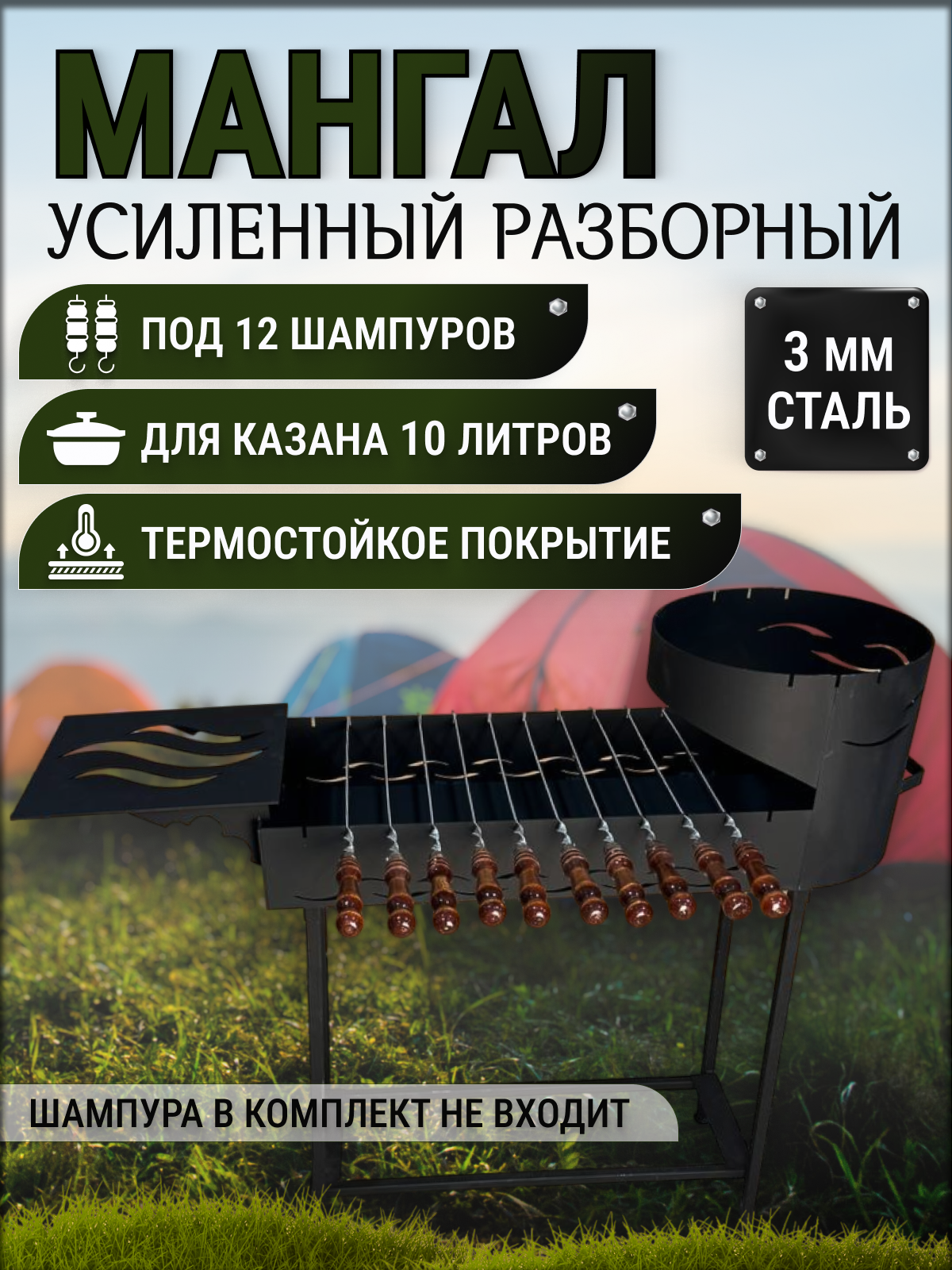 Мангал складной для дачи разборный из стали 3 мм под 12 шампуров с печью под казан 10 литров
