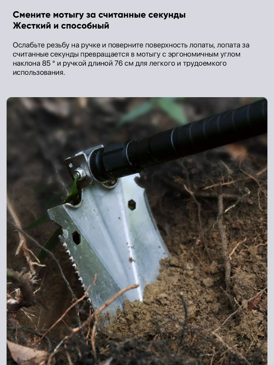 | Плюсы: | Отличная многофункциональная лопата, занимающая минимум места |