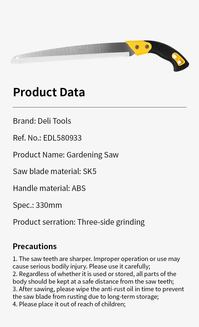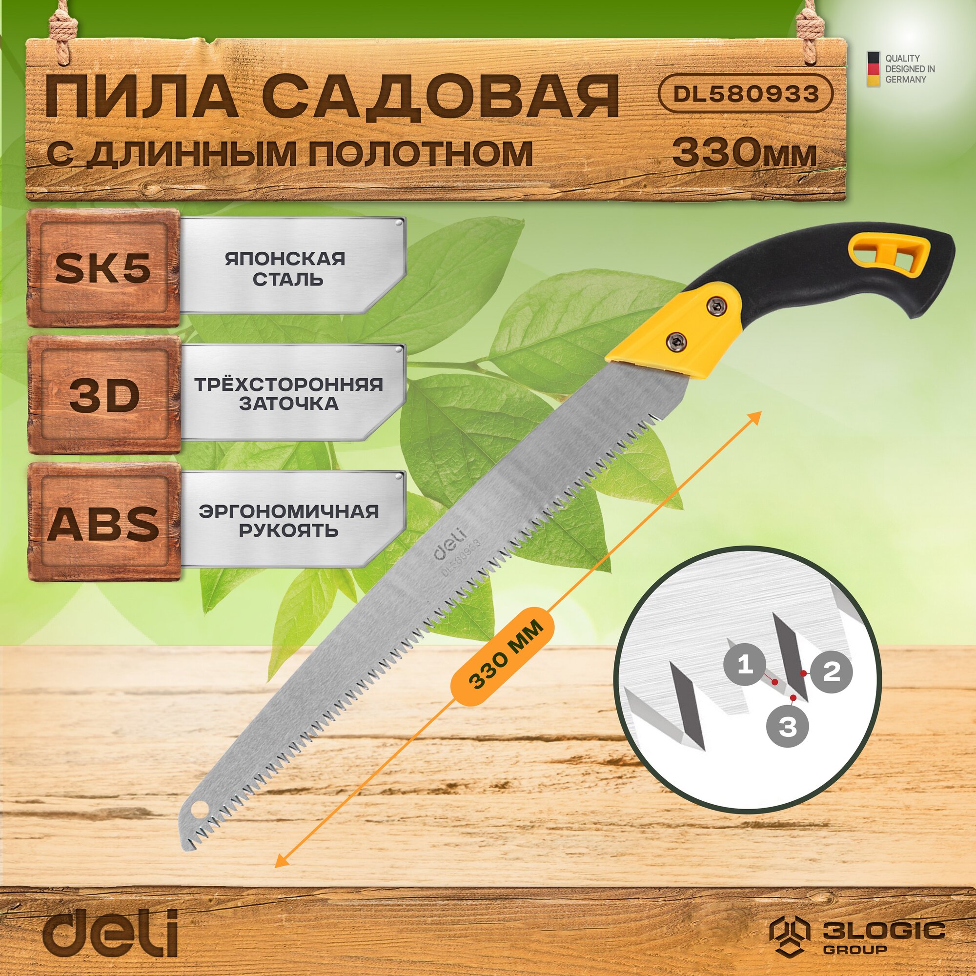 Садовая пила (ножовка) удлиненная по дереву Deli DL580933 330мм (7 зубьев на дюйм, 3D заточка, обрезиненная ручка, двухрядное распределение зубцов)