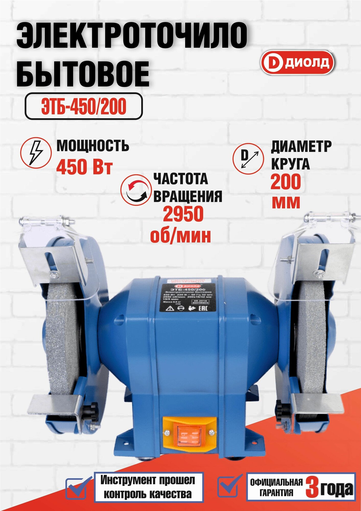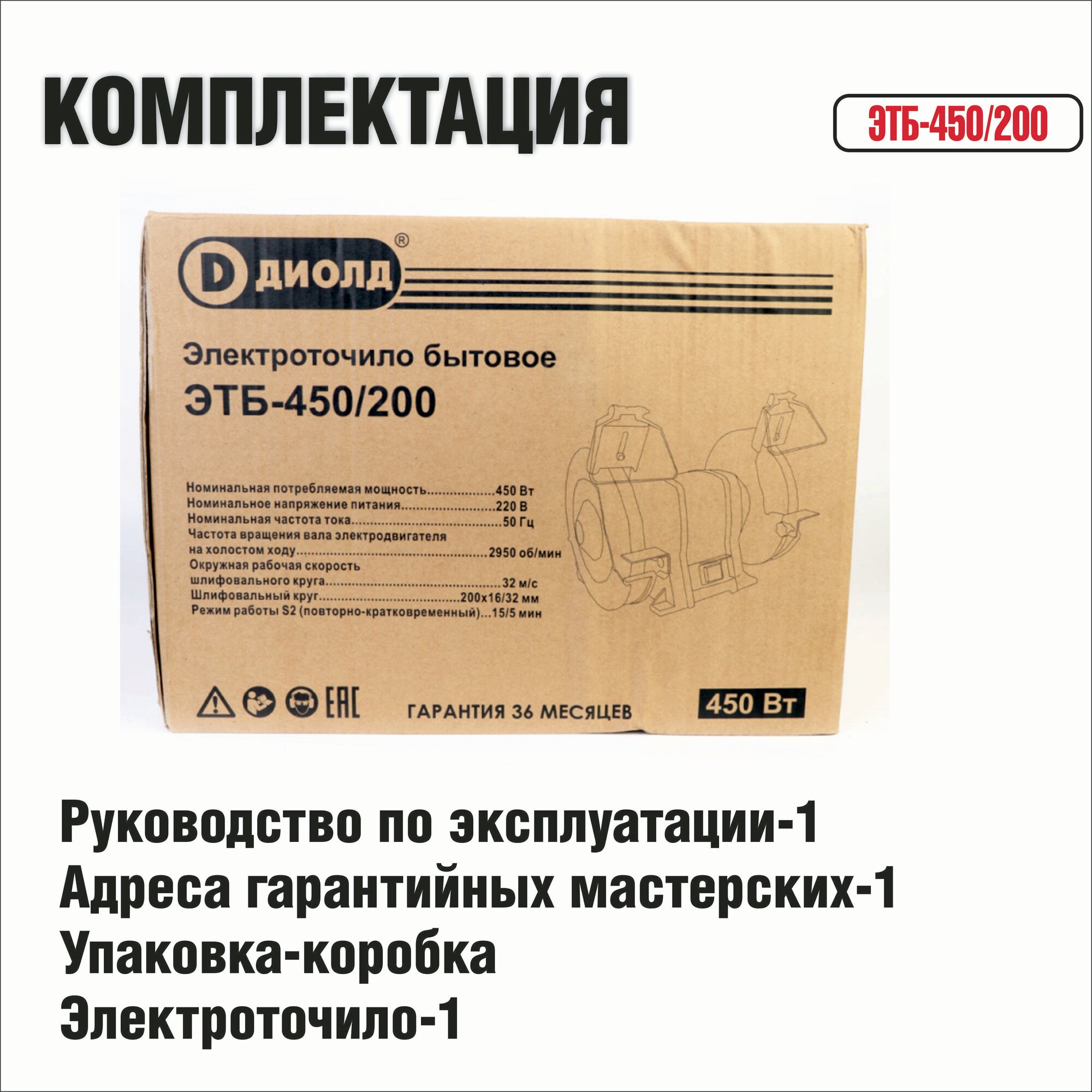 Электроточило диолд ЭТБ-450/200 / точильный станок, 450 Вт, 2950 об/мин, 200мм круг, производитель Россия