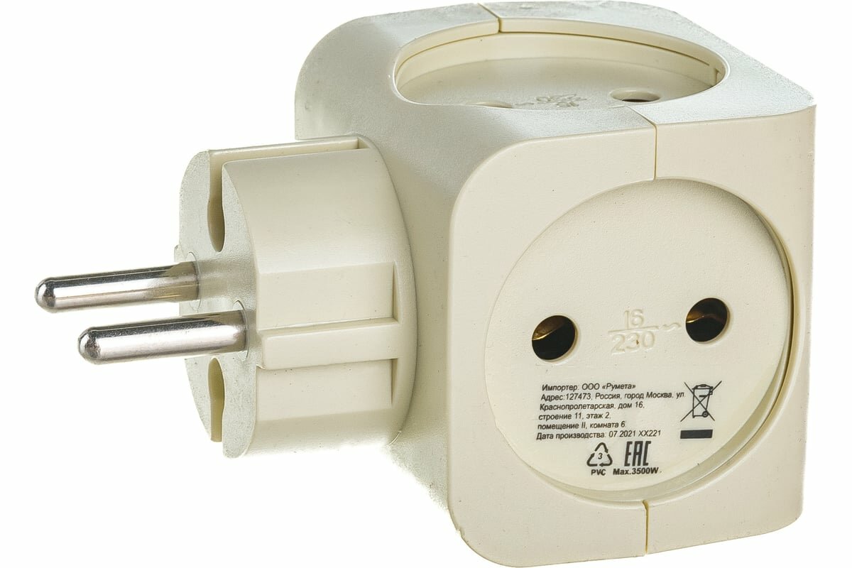 Тройник разветвитель электрический без заземления, 4 розетки, 16А, белый