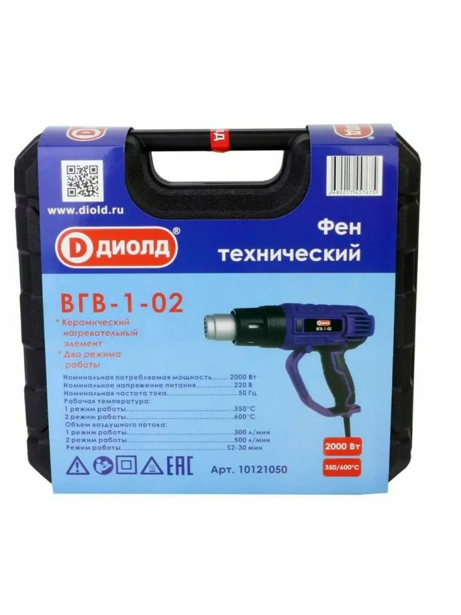 Фен технический Диолд ВГВ-1-02, 2000 Вт / Фен строительный в кейсе, 2000 Вт, 2 режима, 4 насадки