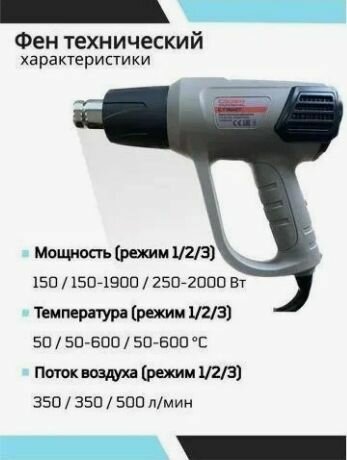 | Дополнительная информация | 3 режима работы - 50 °C, 350 л/мин; 50-600 °C, 350 л/мин; 50-600 °C, 500 л/мин |