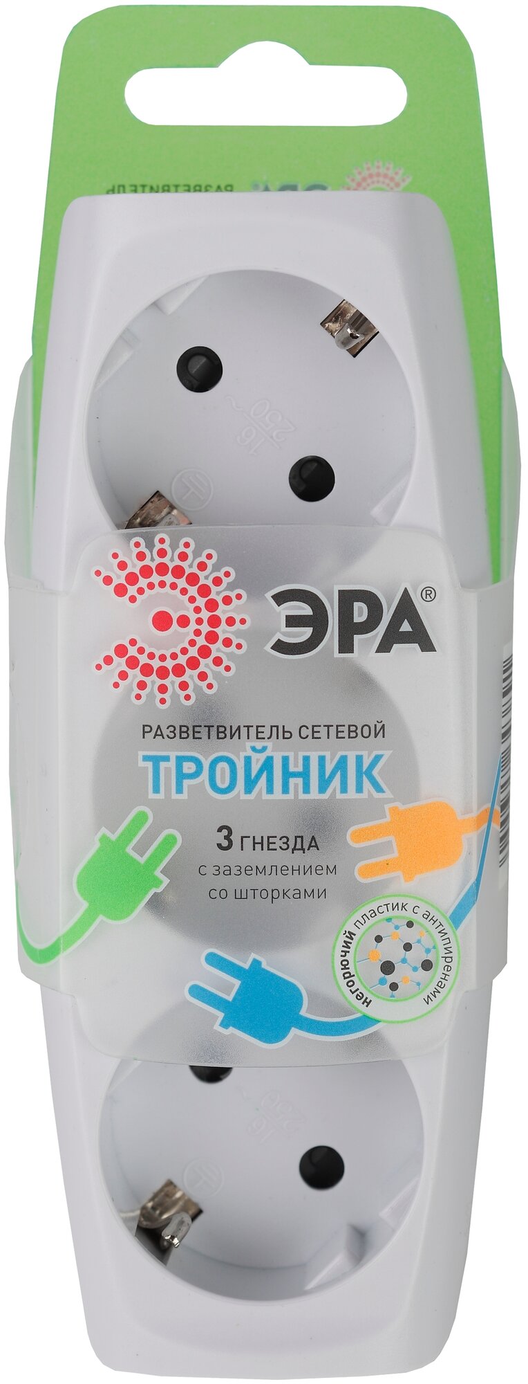 Тройник Эра "SP-3e", белый, 3 разъема, негорючий поликарбонат, шторки, заземление, 16А/3680 Вт.