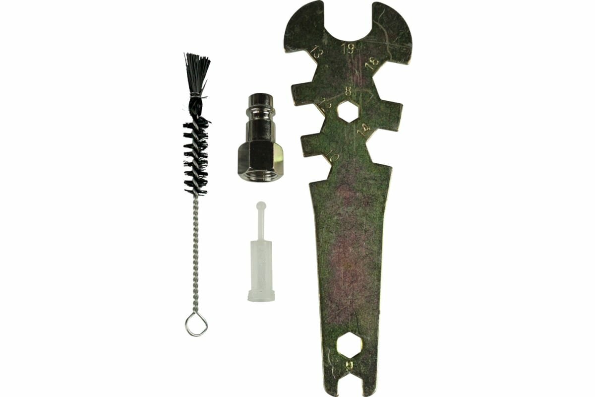 | Комплектация | бачок, адаптер-соединитель с резьбы F1/4″ на быстросъём M1/4″, пластиковый мини-фильтр для ЛКМ, ключ универсальный для обслуживания краскопульта, щётка для чистки, инструкция по эксплуатации |