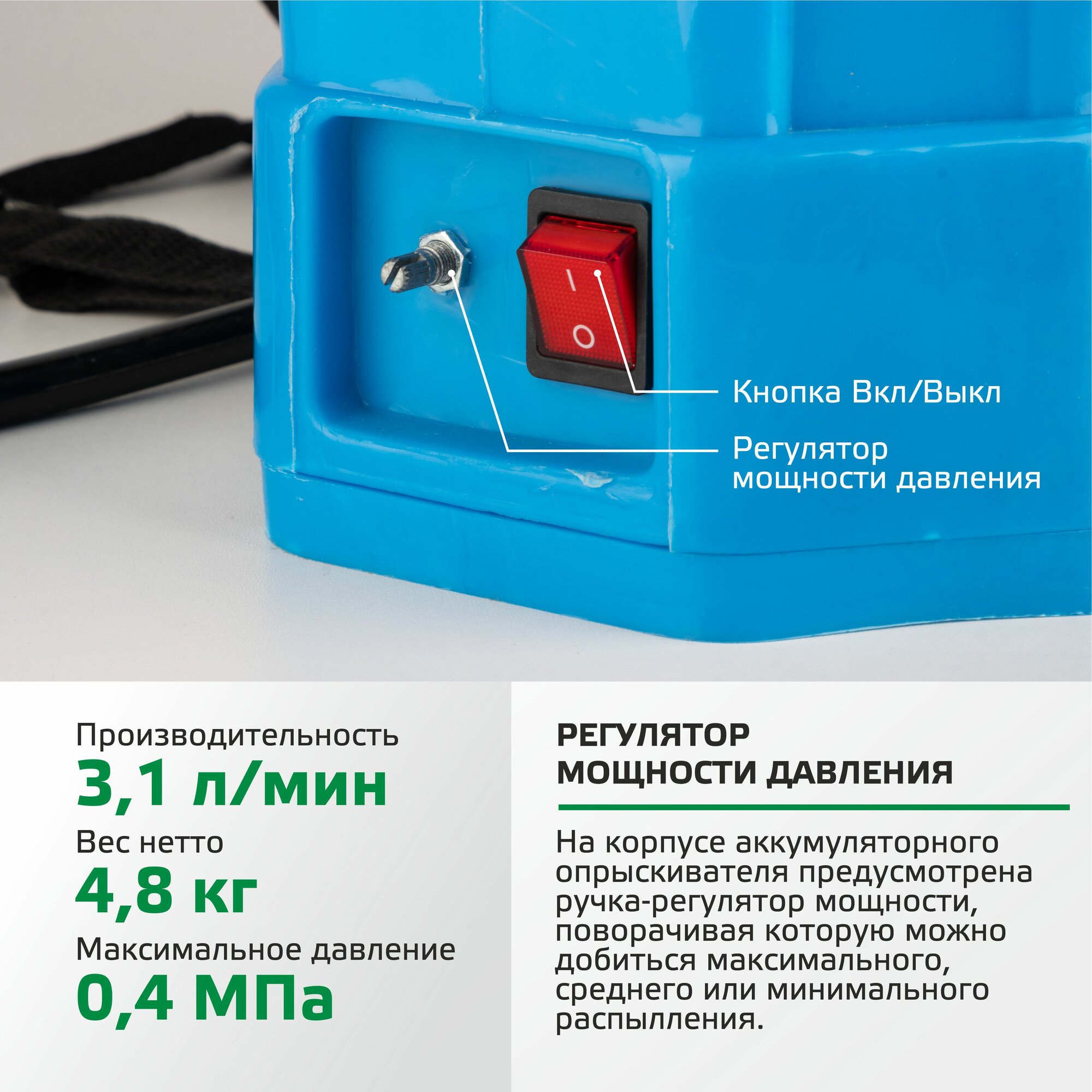 - К одеванию лямок нужно привыкнуть. Лучше это делать на пустом опрыскивателе. Первый раз просил помощи, чтобы одеть вторую) - "имеет регулятор мощности насоса и вольтметр". Регулятор мощности - да, присутствует и работает. "вольтметр"? Вы серьезно? Трехцветный индикатор заряда - отнюдь не вольтметр. Лучше так его и назовите, а то на нечёткой фотке выглядит и правда как вольтметр. |