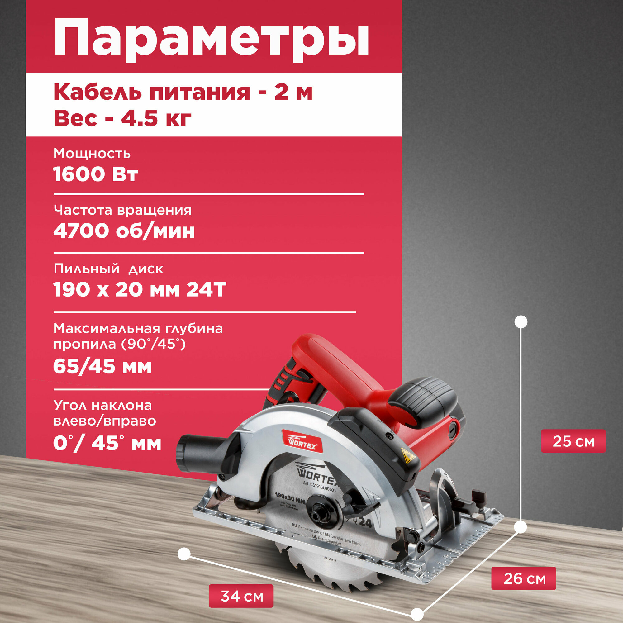 Дисковая пила Wortex Пила циркулярная WORTEX CS 1916 L (CS1916L00021), 1600 Вт