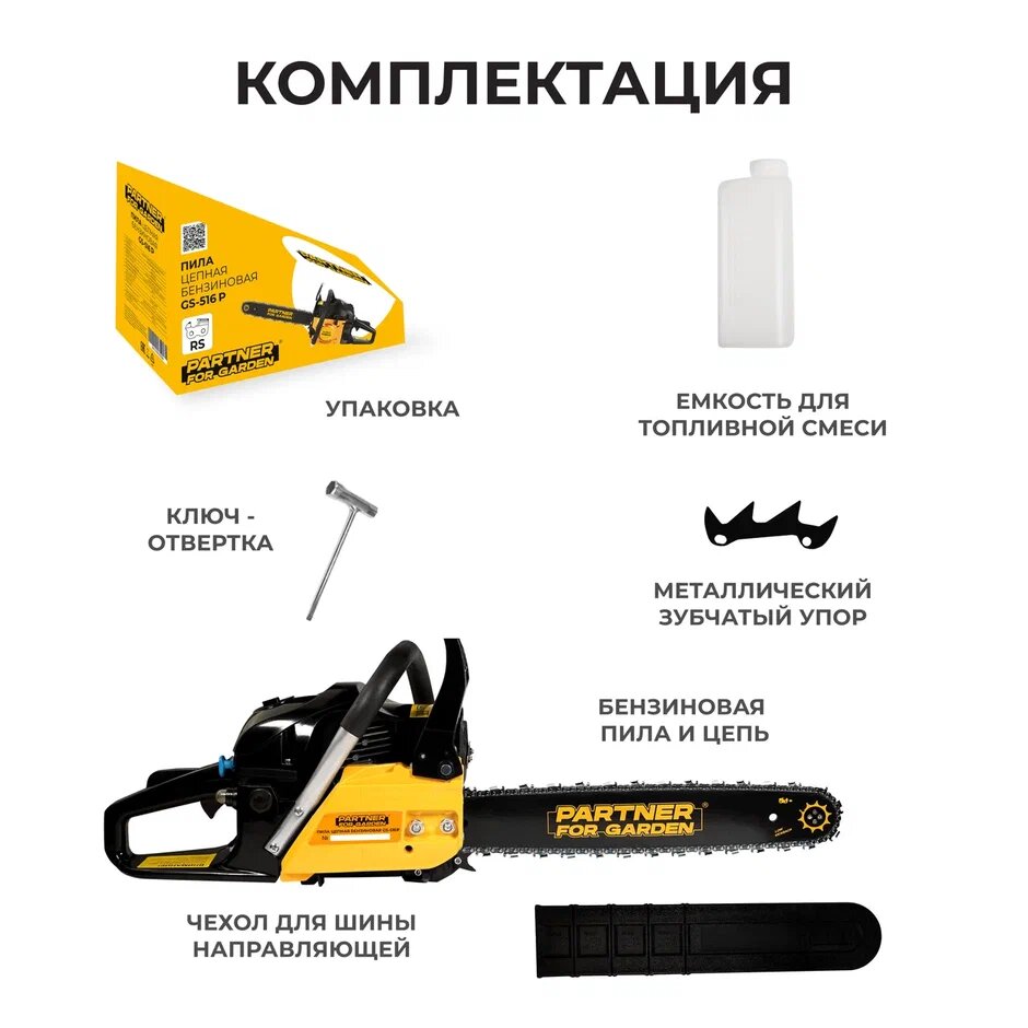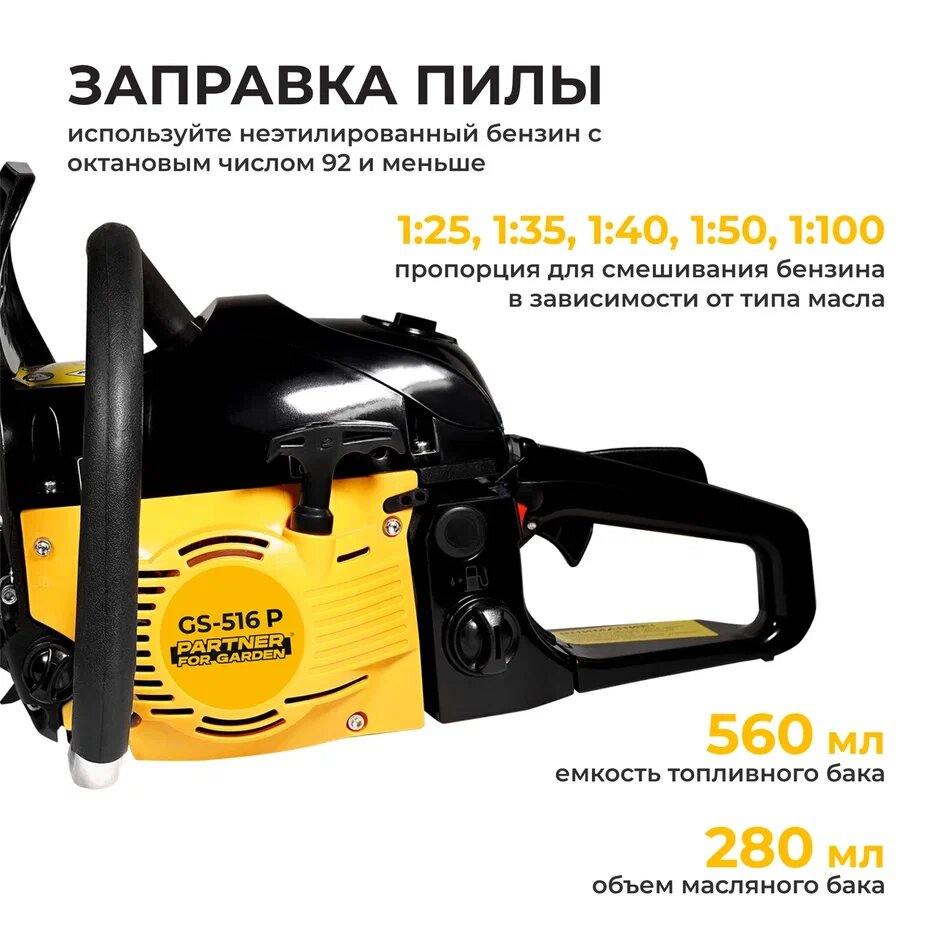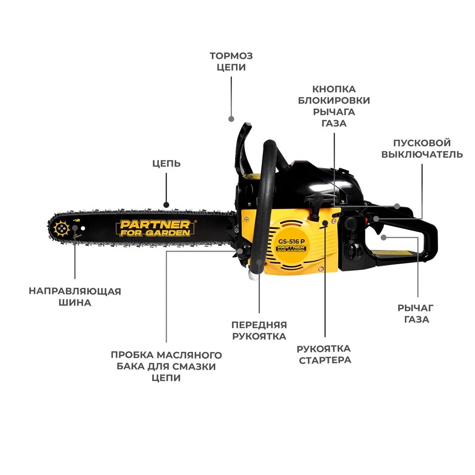 Бензопила / Бензопила бензиновая / Пила / Бензопила Partner for Garden GS-516P бензиновая ( 3,5 л.с, мощность 2,4 кВт, длина шины 16" - 40 см )
